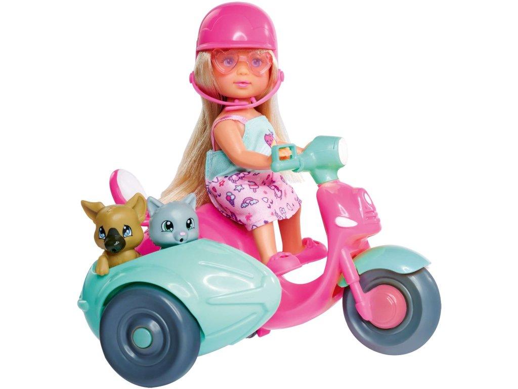Panenka Evi má dlouhé blond vlasy a modré oči. Je oblečena do růžových a tyrkysových šatů, růžových balerínek, helmy a brýlí ve tvaru srdce. Hlava panenky a ruce jsou pohyblivé.
