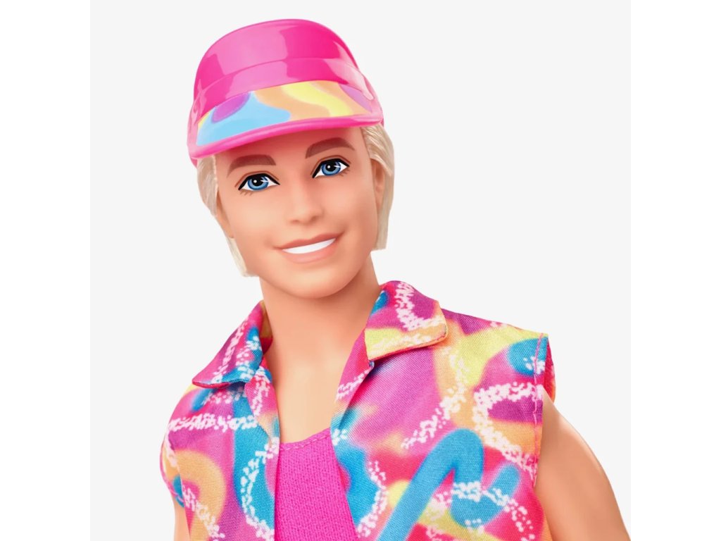 Kenův zářivě barevný obleček vypadá, jako by sjel přímo z velkého plátna - Růžové tričko odkazuje na Barbieinu výstavní barvu