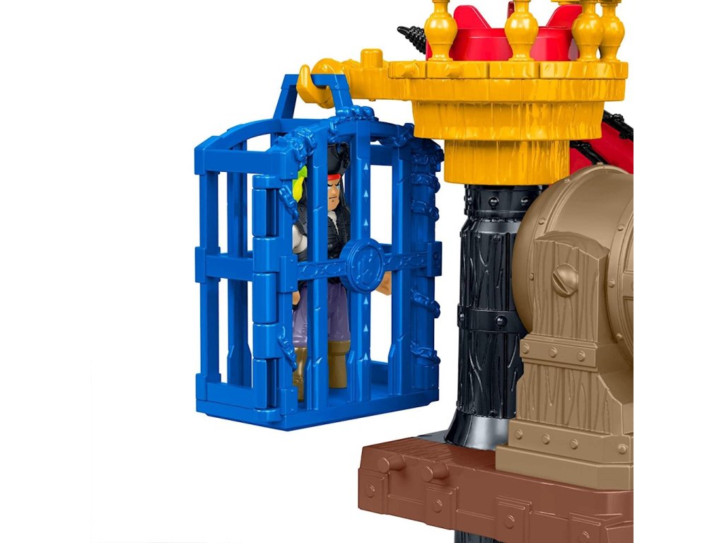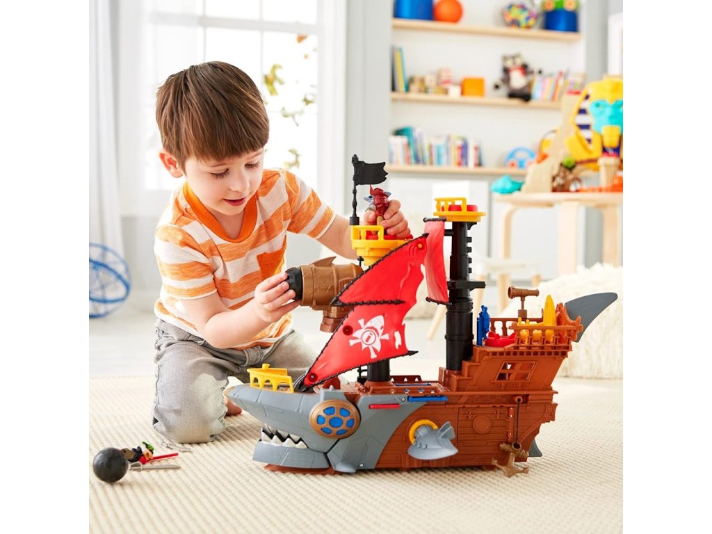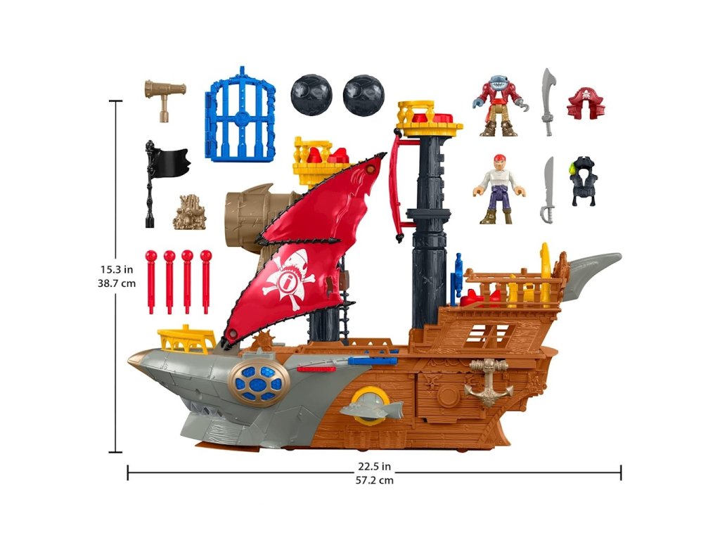 Bláznivá zábava nikdy nekončí s touto sadou Imaginext Pirate Ship Shark od Fisher-Price. Abyste ochránili svůj poklad před Černovousem a jeho bandou lupičů, stiskněte napájecí disk a chyťte padouchy do žraločí tlamy. Pokud se chcete pobavit pirátským stylem, můžete střílet granáty z děla, zavírat vězně do klece a dokonce je poslat na chůzi po prkně. Chcete mít jistotu, že je váš poklad v bezpečí? Otočte napájecím diskem a odhalte tajný úkryt. (Fuj, pořád je to tady).Obsah a vlastnosti setu: