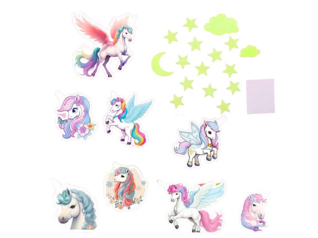 Tato sada fluorescenčních samolepek na zeď jednorožec je kouzelná dekorace, která vnese do dětského pokoje pohádkovou atmosféru. Sada obsahuje barevné jednorožce s krásnými, rozmarnými tvary, které při vystavení světlu ve tmě září a vytvářejí jedinečný vizuální efekt. Fluorescenční hvězdy, měsíc a mraky dotvářejí vzhled, dodávají prostoru jedinečný charakter a činí jej ještě útulnějším.