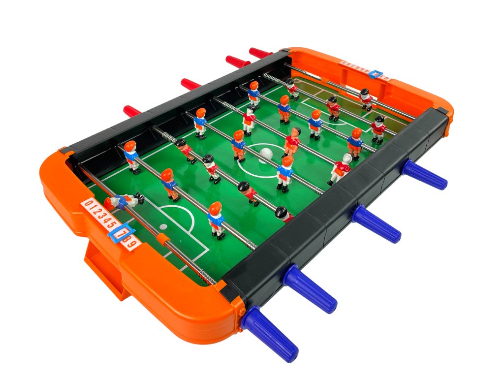 Šikovné knoflíky se dobře drží v ruce, díky čemuž se hráči snadno orientují. Oranžové a černé stojany na hřiště chrání hřiště, aby míč nespadl za hranice trávníku. Nad každou brankou je posuvné počítadlo, které usnadňuje rychlé sčítání bodů pro oba týmy.