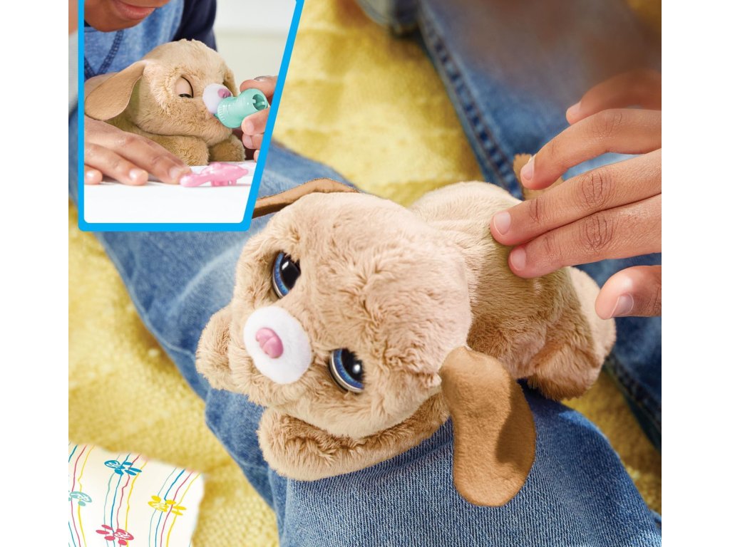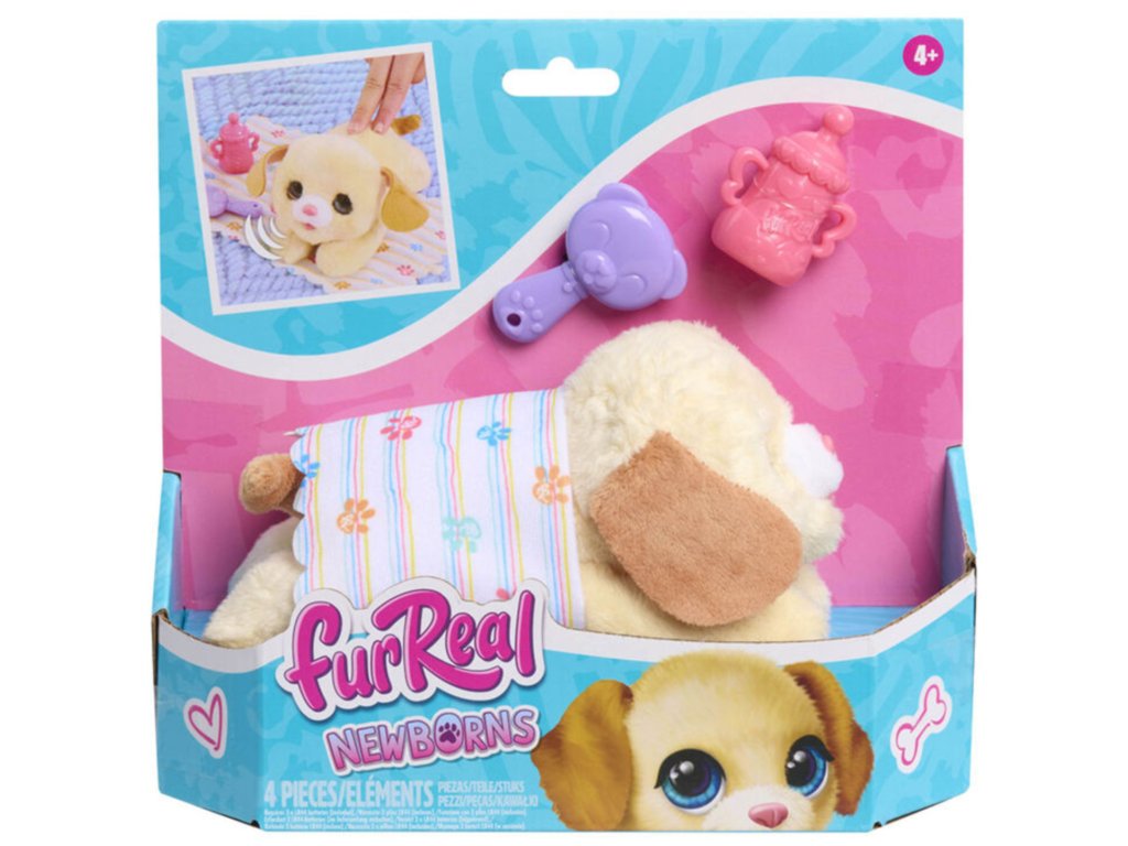 Pes FurReal Newborns je okouzlující mazlíček , který si prostě přeje najít domov, kde se o něj bude dobře starat. Pes má měkkou šedou srst, růžový čumák a velké modré oči. Zvířátko miluje hlazení na zádech , což signalizuje zvuky spokojenosti, a po nakrmení z lahvičky nebo vykartáčování začne pejsek zavírat oči a vydávat šťastné zvuky .