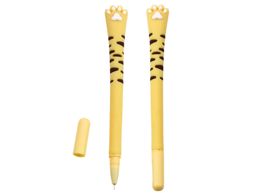 Gelové pero kočičí tlapka modrý inkoust víčko pruhované žluté 16,5 cm