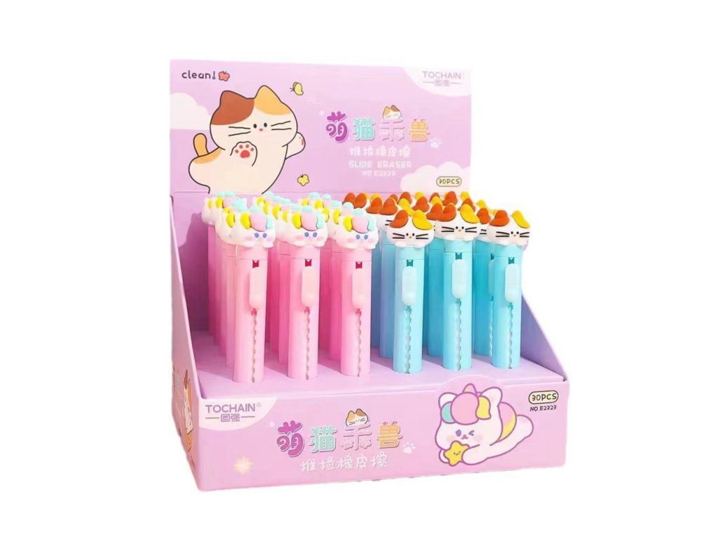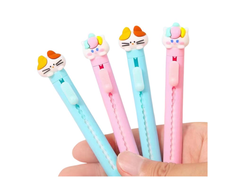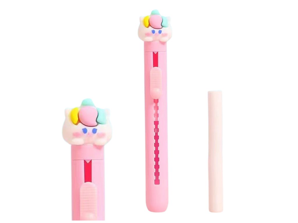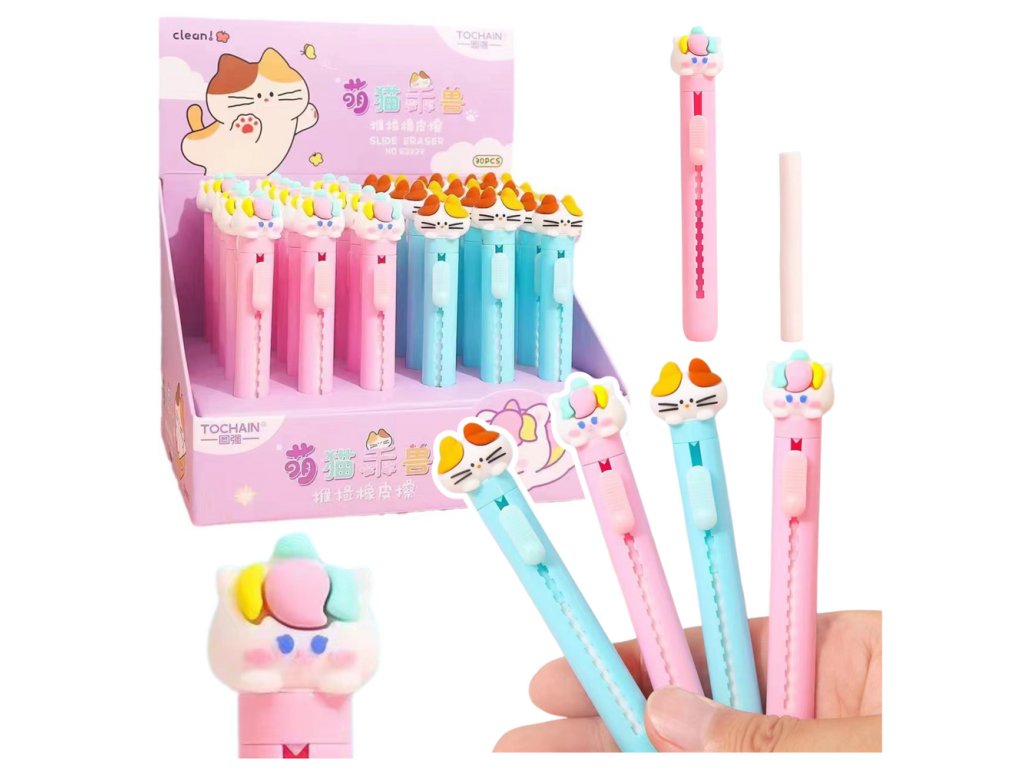 Výsuvná guma s roztomilou figurkou kočky je praktickým a estetickým doplňkem školního setu každého dítěte. Pastelové barvy, vtipný tvar a měkká guma ponořená do písku činí produkt nejen funkčním, ale i vizuálně atraktivním. Ergonomické pouzdro umožňuje snadné zatažení gumy pomocí posuvníku a chrání ji před nečistotami.