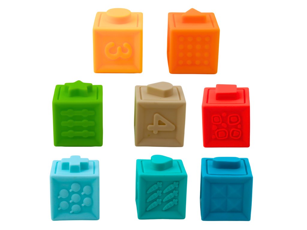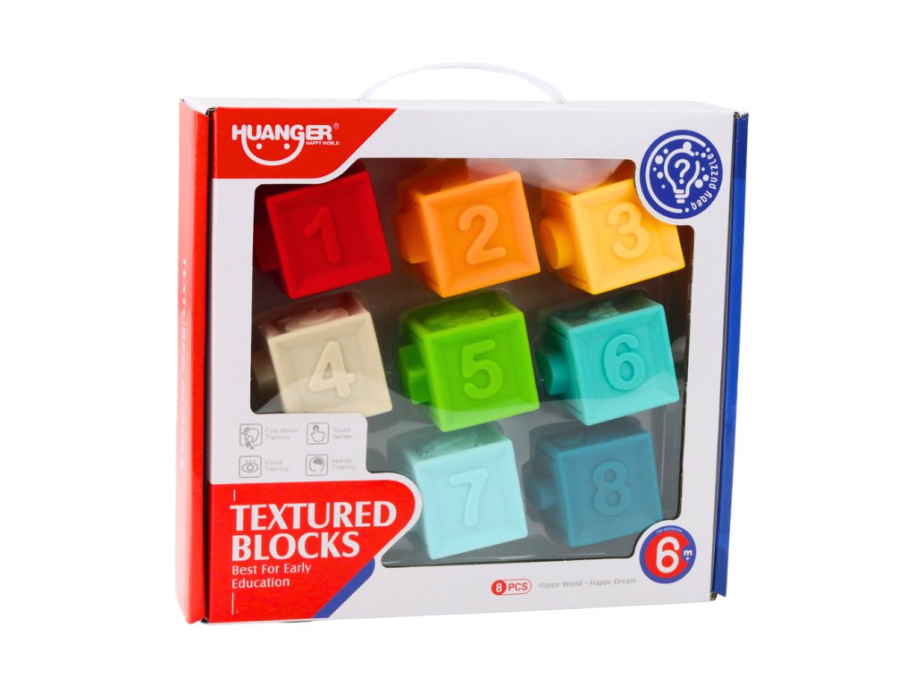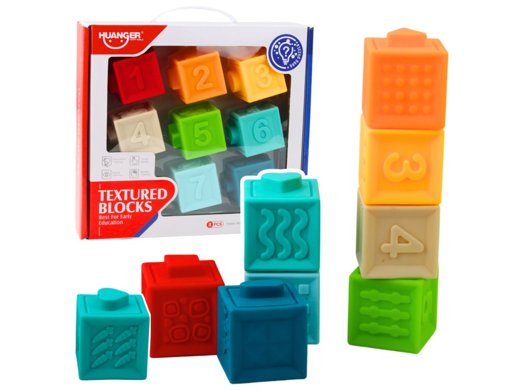 - 8 gumových bloků s texturami, čísly a obrázky