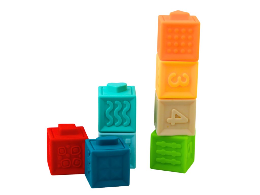 Gumové kostky jsou ideální senzorickou hračkou pro nejmenší, navrženou s ohledem na komplexní rozvoj dětí od 6 měsíců věku. Každý blok je vyroben z měkké, na dotek příjemné gumy, která je zcela bezpečná, netoxická a odolná vůči každodennímu používání - ideální i pro batolata, kterým probíhají zoubky. Dítě je může kousat, mačkat, házet, aranžovat a přiřazovat, a když se kostky zmáčknou, vydávají jemný skřípavý zvuk, který navíc stimuluje sluch a přitahuje pozornost.