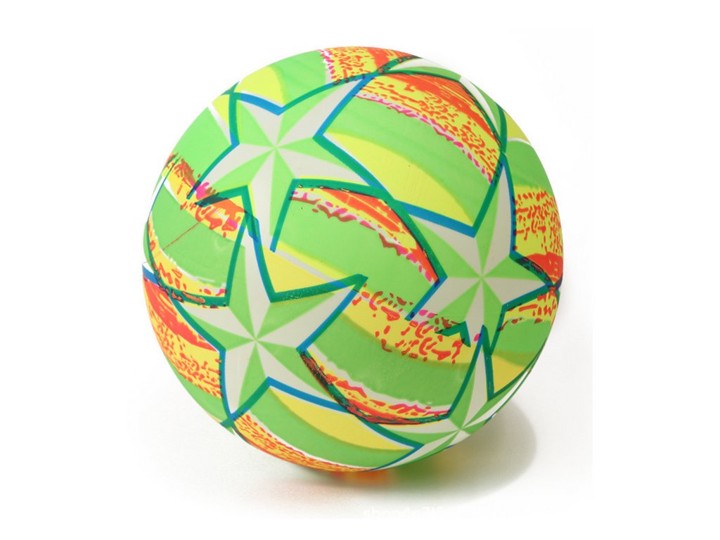 Tento gumový míč vyniká jasnými barvami, které přitahují pozornost a dodávají energii každé hře. Zdobí ho vzory v intenzivních odstínech zelené, žluté, oranžové a černé barvy, takže je nejen vizuálně přitažlivý, ale také snadno rozpoznatelný, a to i při slabém osvětlení.