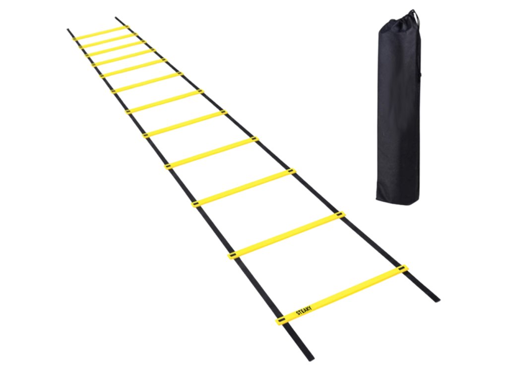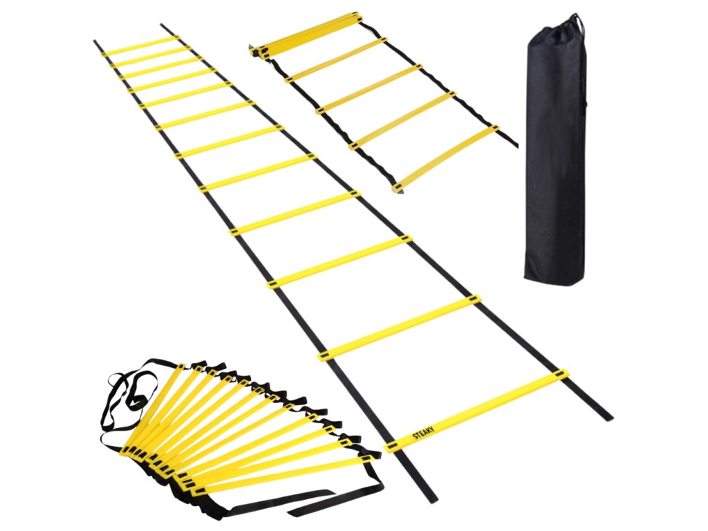 Žebřík je vyroben z odolného PVC a polyetylenové pásky a je odolný vůči intenzivnímu používání v interiéru i exteriéru. 12 nastavitelných příček umožňuje přizpůsobit vzdálenost konkrétnímu typu cvičení a úrovni pokročilosti uživatele.