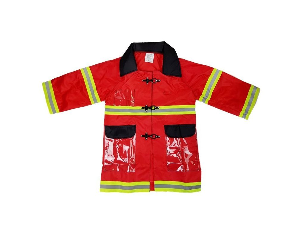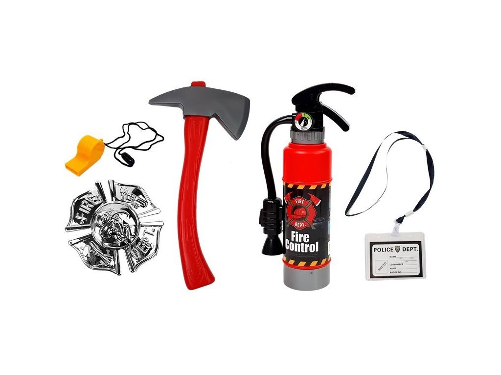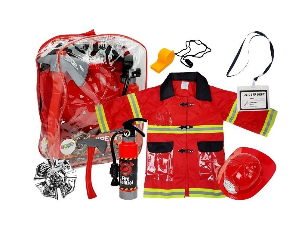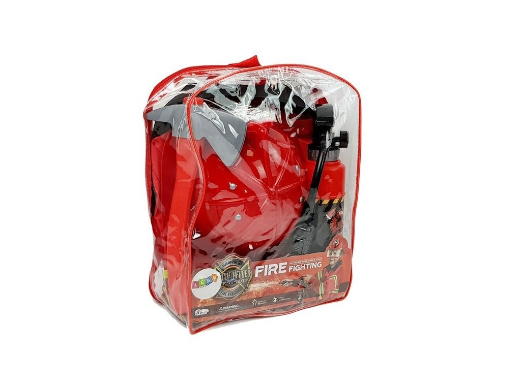 Většina malých kluků sní o tom, že se v budoucnu stanou hasičem a uhasí plameny ohňů, tato sada jim dá pocit, že jsou skutečnými hasiči. Hasičská bunda má odrazky, průhledné kapsy, přilba hasičský odznak. Hasicí přístroj funguje jako sprinkler - stačí do něj nalít vodu a uhasit požáry! Celé je to zabaleno v průhledném batohu, takže si ho snadno vezmete kamkoliv.