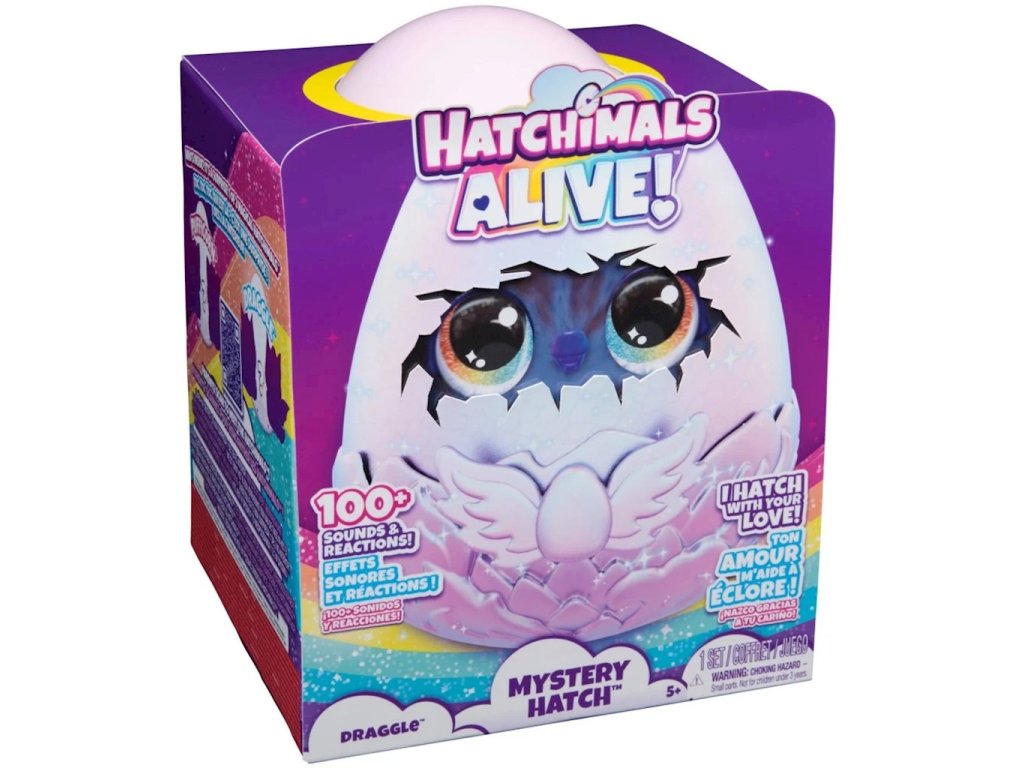 Hatchimals Alive Mystery Hatch Kouzelné vajíčko Draggle Drags 6069282Hatchimals Alive Mystery Hatch je kouzelné, interaktivní vajíčko, které po vzrušujícím vylíhnutí odhalí jednoho ze dvou rozkošných Draggle Dragl Draků. Během líhnutí obsahuje překvapivá světla, zvuky a dokonce i mlhu, které dodávají ještě větší tajemství! Reaguje na dotek, houpání a péči – čím více lásky mu dáte, tím rychleji se vylíhne a bude zpívat veselou písničku Hatchiho narozeniny. Po vylíhnutí může váš nový kamarád tančit, mávat křídly, učit se mluvit, hrát si a reagovat na mazlení. Více než 100 reakcí a funkcí zaručuje hodiny zábavy.
