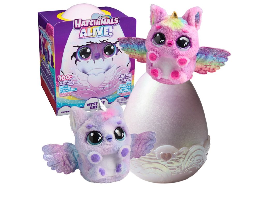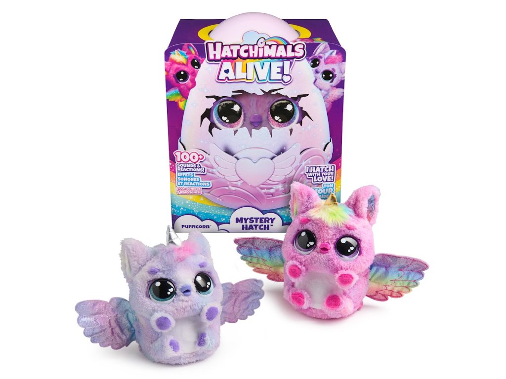 Hatchimals Alive Mystery Hatch Magical Pufficorn Egg 20145447Hatchimals Alive Mystery Hatch je kouzelné, interaktivní vajíčko, které po vzrušujícím vylíhnutí odhalí jednoho ze dvou rozkošných pufficornů. Obsahuje překvapivá světla, zvuky a dokonce i mlhu, když se vylíhne, aby dodal nádech tajemna! Reaguje na dotek, houpání a péči – čím více lásky mu dáte, tím rychleji se vylíhne a bude zpívat veselou píseň Hatchi-Birthday. Jakmile se váš nový přítel vylíhne, může tančit, mávat křídly, učit se mluvit, hrát si a reagovat na mazlení. Více než 100 reakcí a funkcí zaručují hodiny zábavy.