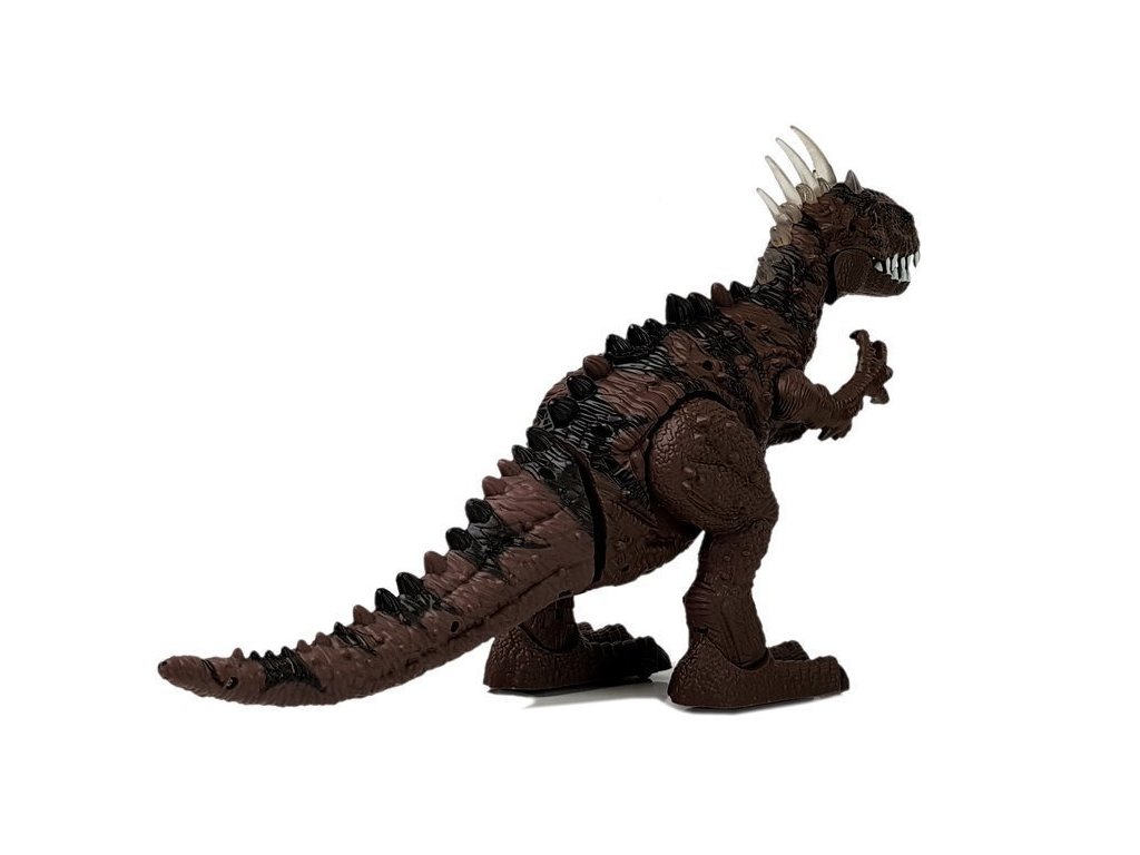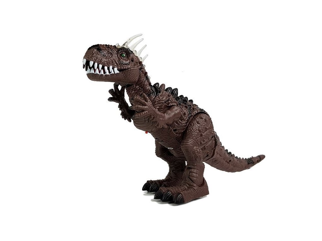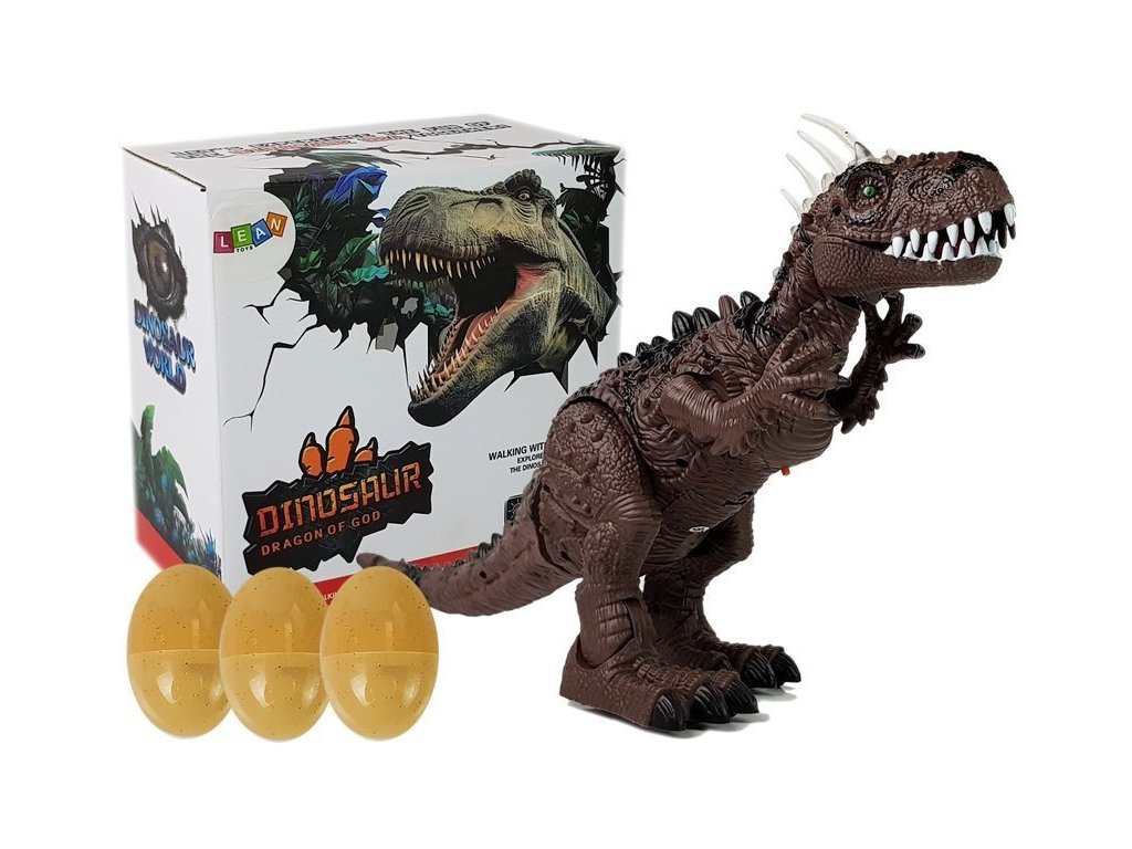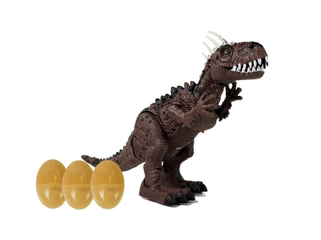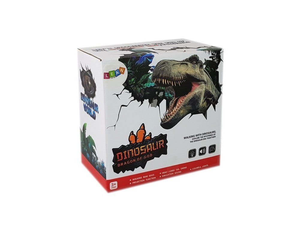 Tyrannosaurus Rex má na temeni hlavy velké šupiny , které září různými barvami. Další výhodou je jeho velká lebka, mohutná, svalnatá stavba těla a velké sněhově bílé zuby. Hnědá v kombinaci s černými prvky a všemi doplňky, šupinami a dlouhými drápy nám dává pocit, že dinosaurus je skutečný! Dinosaurus se pohybuje vpřed, pohybuje hlavou a horními končetinami, otevírá a zavírá tlamu, vydává řvoucí zvuk a pohybuje tělem doprava a doleva. Kladení vajíček je další výhoda! Sada obsahuje 3 kusy, prohoďte je otvorem na zadní straně a sledujte, jak jsou vajíčka ze dna snesena při pohybu. Po zapnutí plaza se zobrazí fotografie skutečného tyranosaura, projektor je umístěn na kleci. Můžeme se dozvědět tajemství, jak vypadá skutečný dinosaurus. To je pro vaše dítě velké dobrodružství.