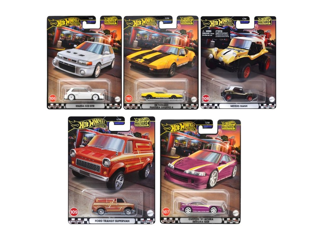 Sada Hot Wheels Boulevard 5 kusů Ford Transit Supervan, Meyers Manx, Custom '01 Acura Integra GSR, Custom De Tomaso Pantera Gruppo 4, Mazda 323 GTRHot Wheels Boulevard je série dárkových vozidel v měřítku 1:64 s dárkovou grafikou Real Rider pro všechny modely a prémiové pneumatiky věk.