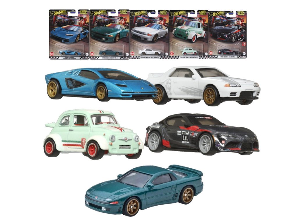 Sada Hot Wheels Boulevard 5 upravených vozů Fiat 500 D, Nissan Skyline GT-R, Mitsubishi 3000GT VR-4 Lamborgini Countach a Toyota GR Supra 2021Hot Wheels Boulevard je série dárkových vozů v měřítku 1:64 pro všechny modely s tlakovou grafikou a pneumatikami Rider v měřítku 1:64 věk.