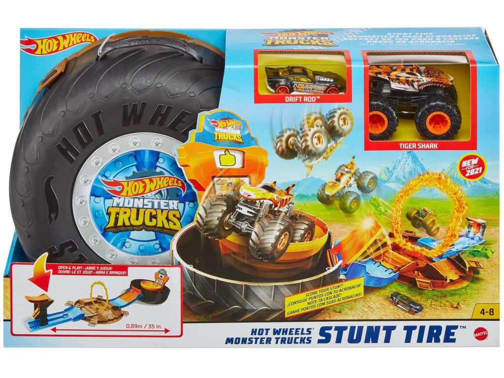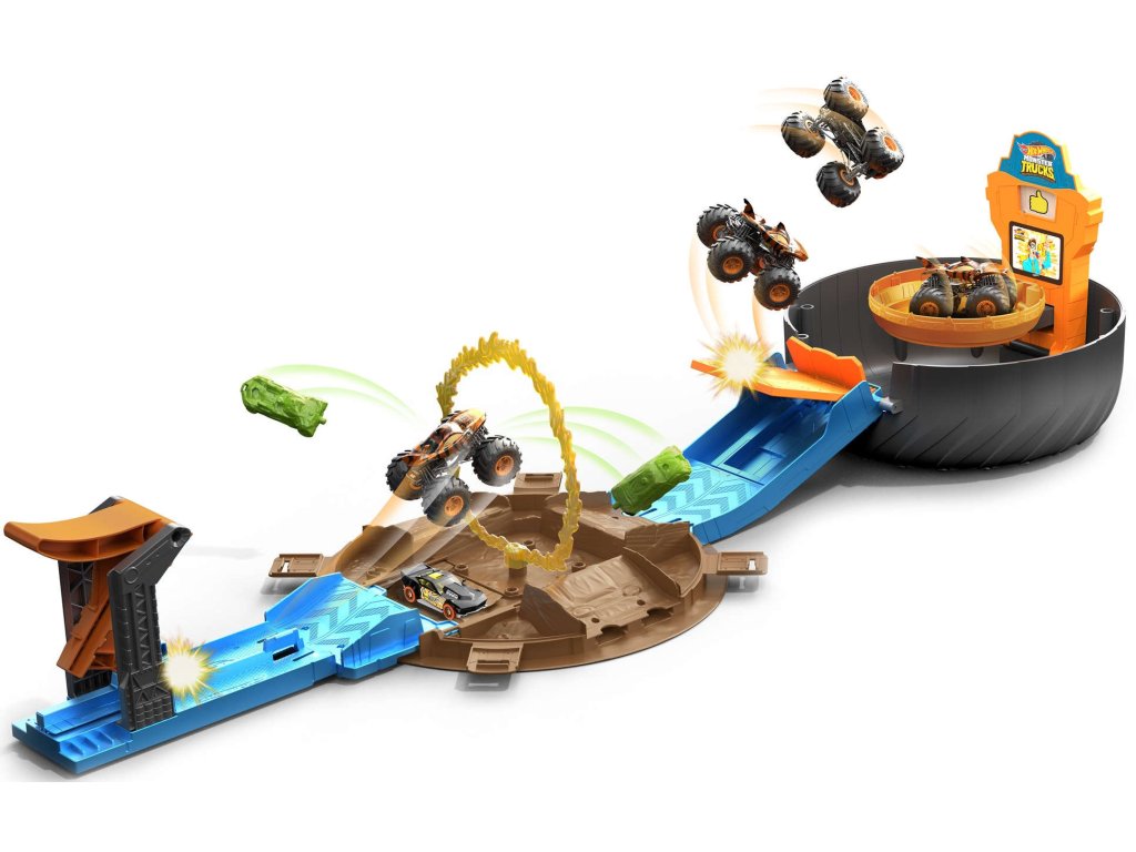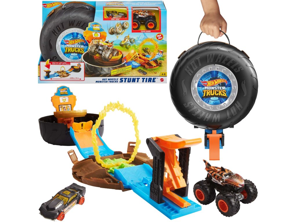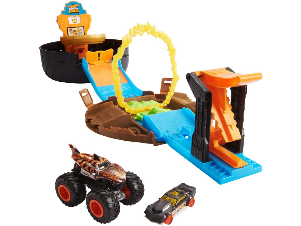 Sada navíc obsahuje také vozidlo Hot Wheels a nebezpečné monstrum nákladní auto.