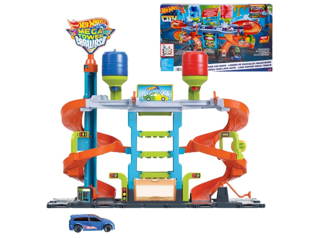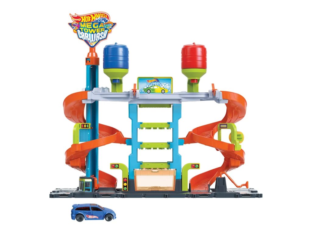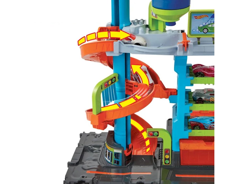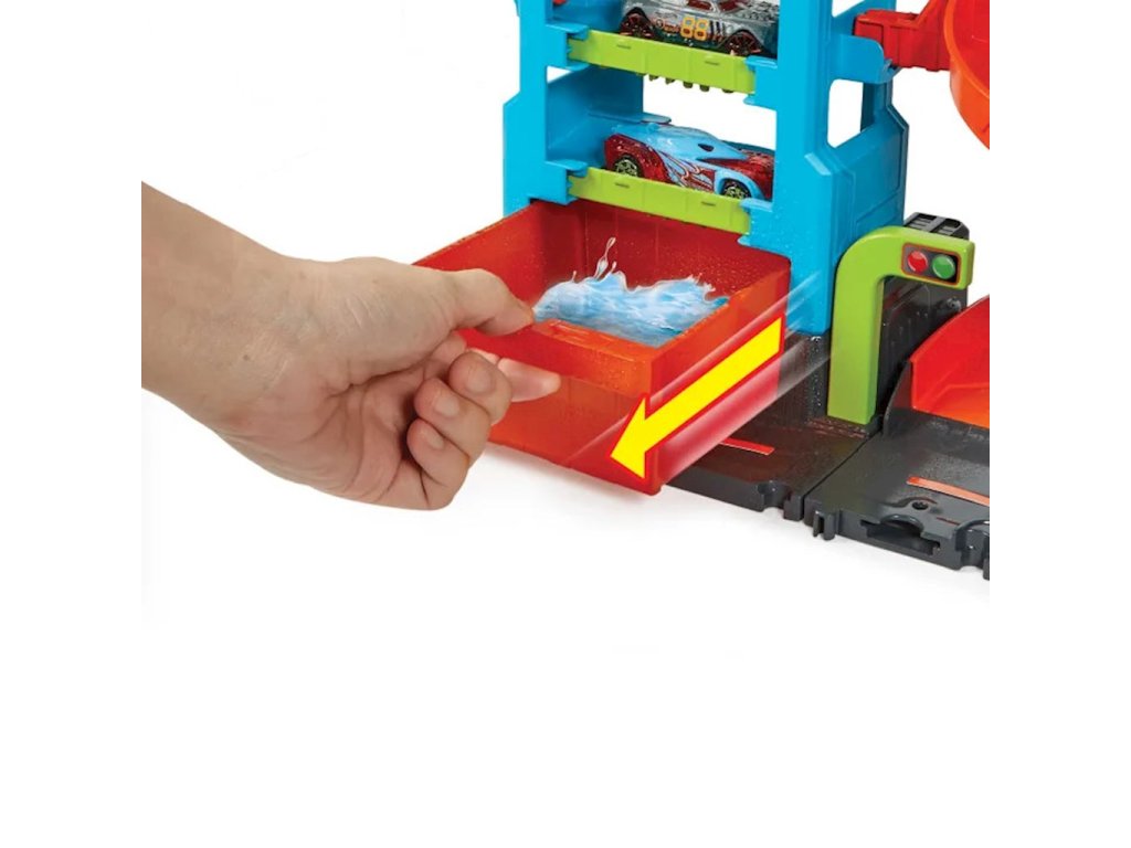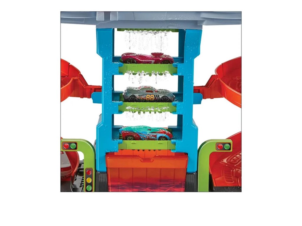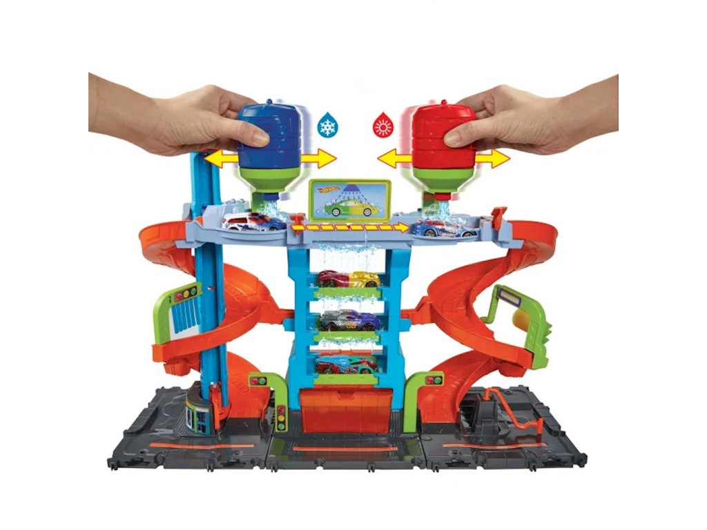 Hot Wheels City Mega Car Wash HDP05Hot Wheel City Mega Car Wash je čistá zábava! Zajeďte do jedinečné myčky aut a roztočte značku, abyste vyšplhali na vrchol rotující spirály. Nahoře jsou dvě nádrže – jedna se studenou vodou, druhá s teplou vodou. Nastříkejte na vozidlo Color Shifter, abyste změnili jeho barvu. Vhodně umístěná vanička zachycuje kapající vodu z vozidla, takže se nemusíte bát nepořádku. Mega Car Wash lze propojit s dalšími sadami a postavit tak úžasné město Hot Wheels. Prodává se samostatně.