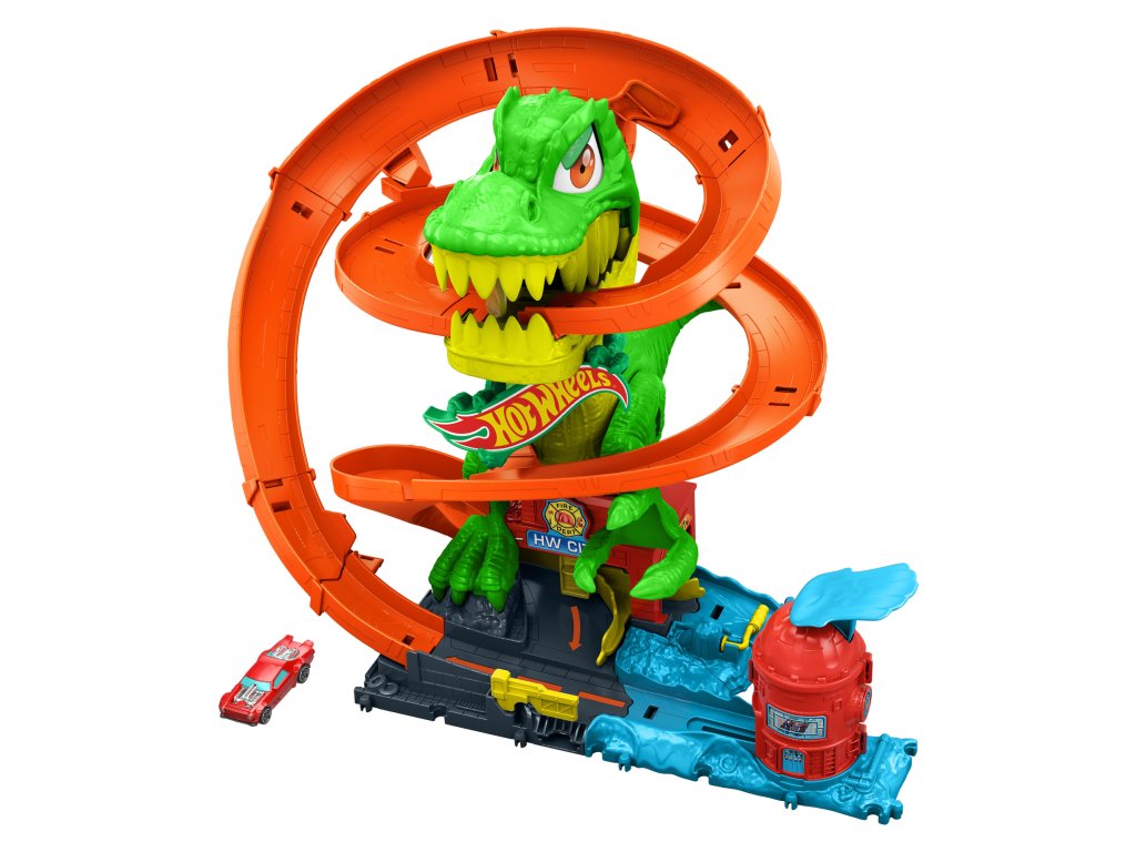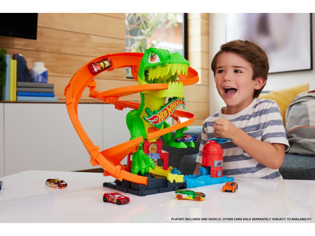 - Akce s dinosaurem - Projeďte přiloženým autíčkem Hot Wheels v měřítku 1:64 ústy T-Rexe, abyste mu „vyrazili“ zuby a změnili vzhled očí.