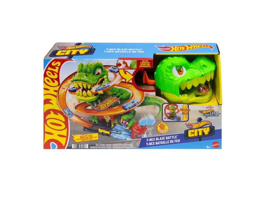 Posuňte zábavu na další úroveň se sadou Hot Wheels City T-Rex Firehouse o výšce 36 cm. Tato dynamická dráha je plná akce, kde se děti musí postavit hladovému dinosaurovi útočícímu na město. Ústředním prvkem sady je T-Rexova obrovská hlava . Auto Hot Wheels v měřítku 1:64 dokáže projet tlamou, vyrazit zuby a změnit výraz nestvůry . Pokud je auto „sežráno“, je vyhozeno zpod ocasu, což hře dodává humor a překvapení. Zakroucená trať vede přes následující výzvy a další prvky, jako je otočný nápis Hot Wheels a místo pro uložení auta v dinosauřích drápech, obohacují herní scénáře. Po porážce T-Rexe jednoduše resetujte sadu a začněte vzrušující akci úplně znovu. A co víc, „T-Rex Firehouse“ lze propojit s dalšími tratěmi Hot Wheels City a vytvořit tak obrovské město plné dobrodružství. Je to perfektní volba pro děti, které milují rychlá auta, velkolepou akci a nekonečné příběhy s dinosaury jako hlavními postavami.