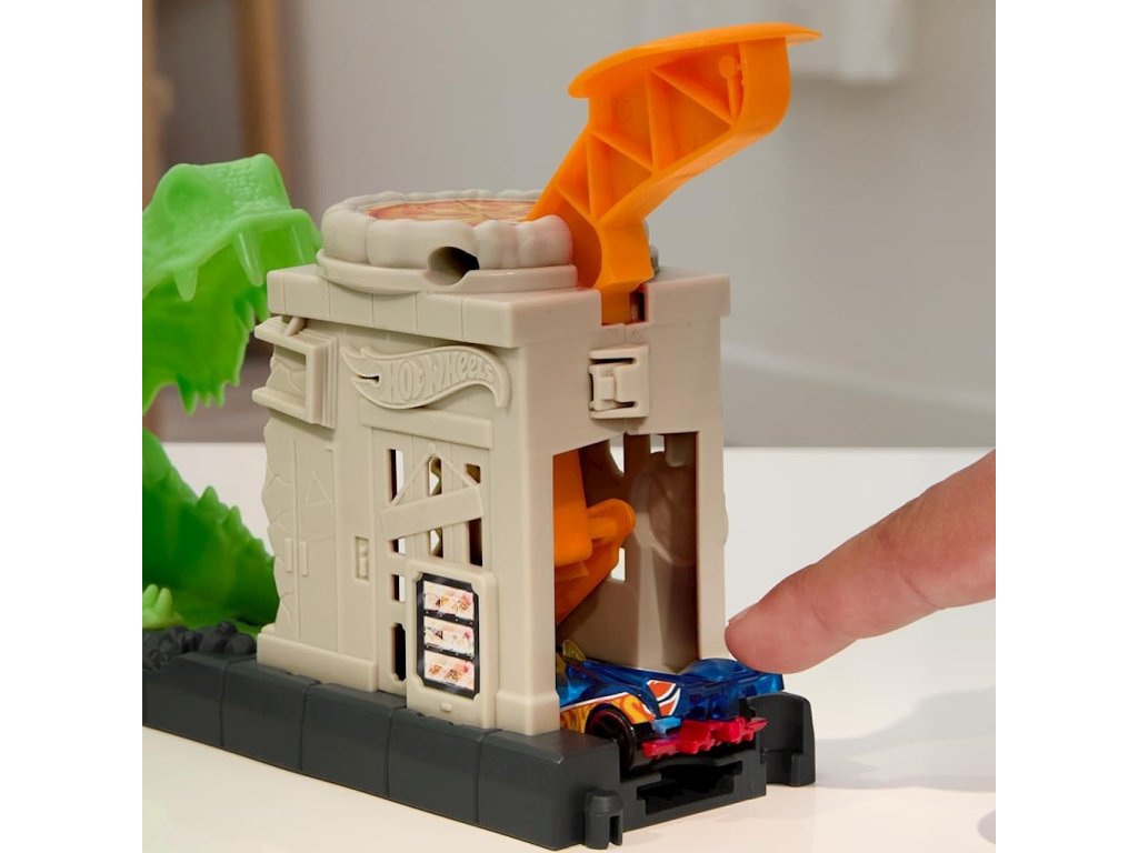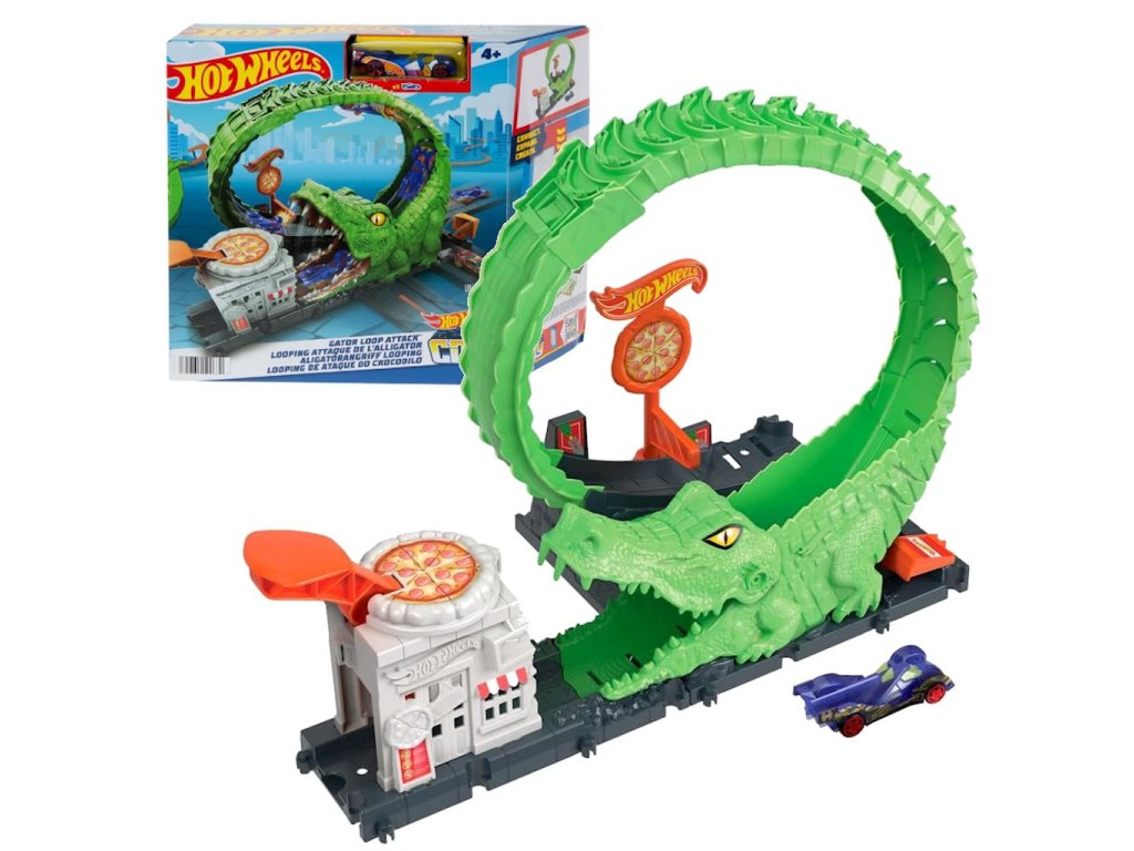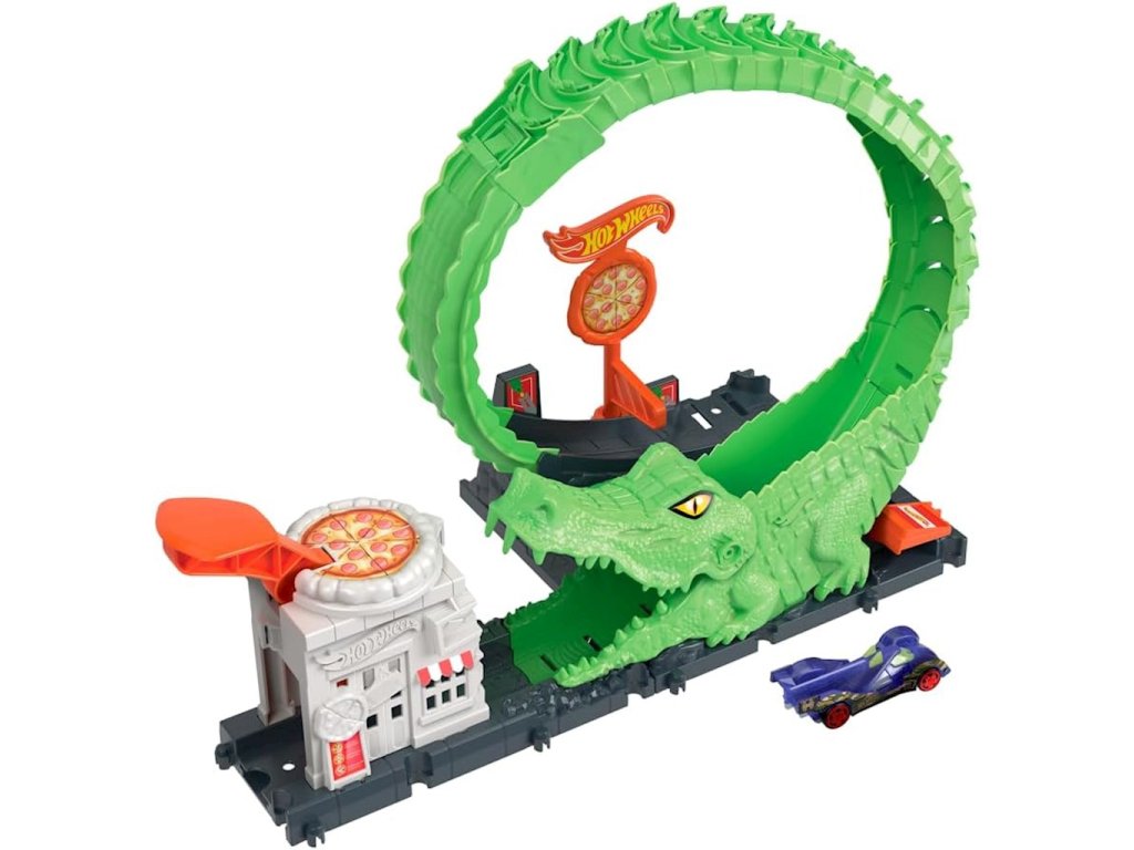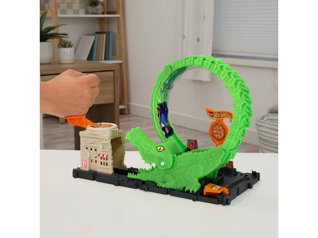 Hot Wheels City Crocodile Loop HKX39Hot Wheels City Crocodile Loop obsahuje obrovského plaza číhajícího poblíž pizzerie požírat vozidla. Můžete ho zastavit díky úžasné kaskadérské schopnosti? Změňte polohu krokodýlího ocasu, vytvořit smyčku nebo spirálu a užít si celou řadu zábavy dráha. Pokud se vám podaří pořádně začít, plaza porazíte a půjdete dál pokračujte v cestě bezpečně. Sada obsahuje 1 Hot Wheels a auto se připojuje k jiným sadám.