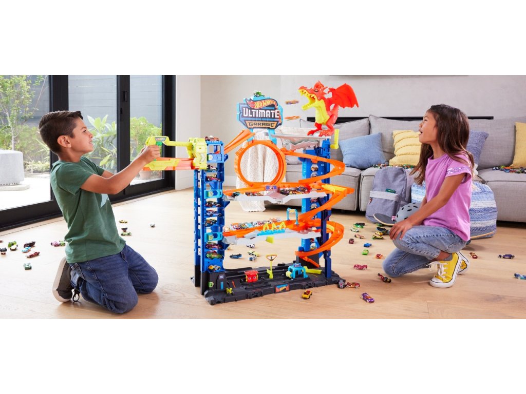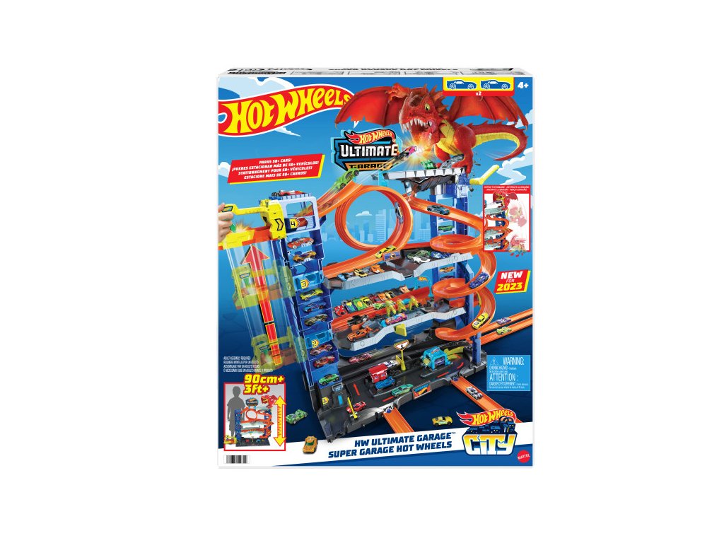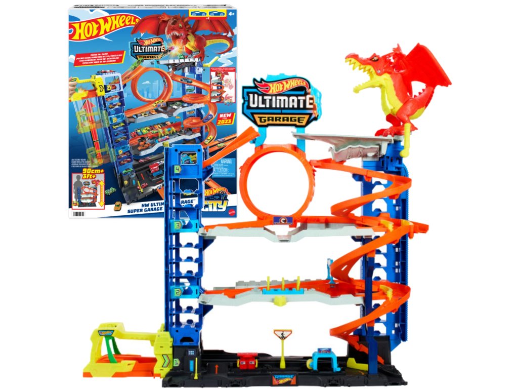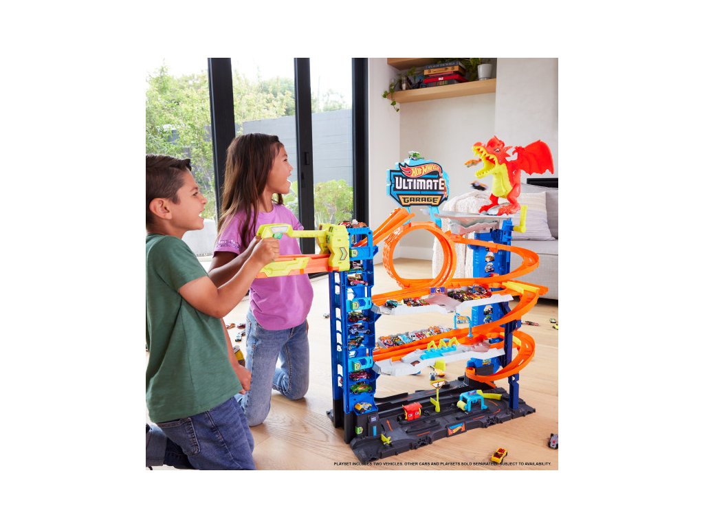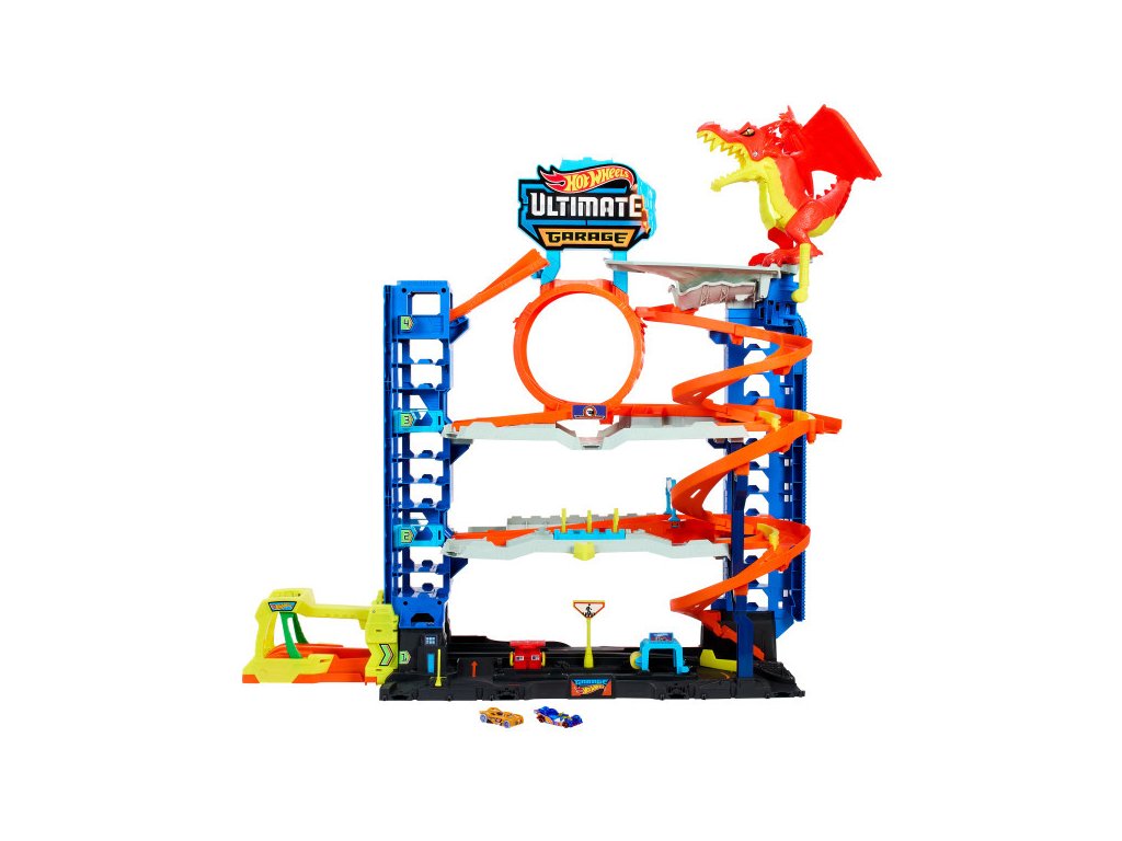 Posuňte zábavu na další úroveň se sadou Hot Wheels Ultimate Garage , která měří neuvěřitelných 90 cm na výšku. Tato dynamická dráha je plná akce, kde se děti musí postavit hladovému drakovi útočícímu na město. Autíčko Hot Wheels v měřítku 1:64 se může spustit ze skokanské plošiny a porazit draka tak, že ho srazí z dráhy. Odražený vůz spadne zpět na dráhu a spirálovitě se vrátí do bezpečí.