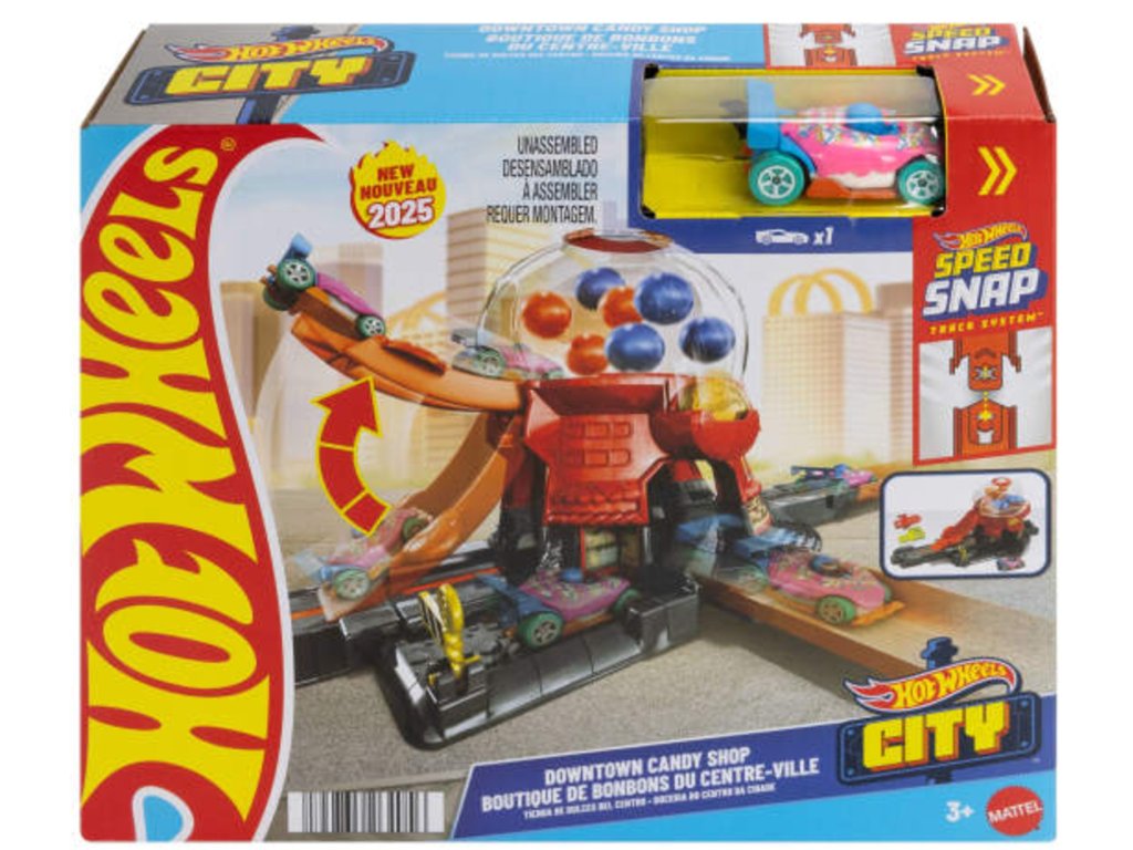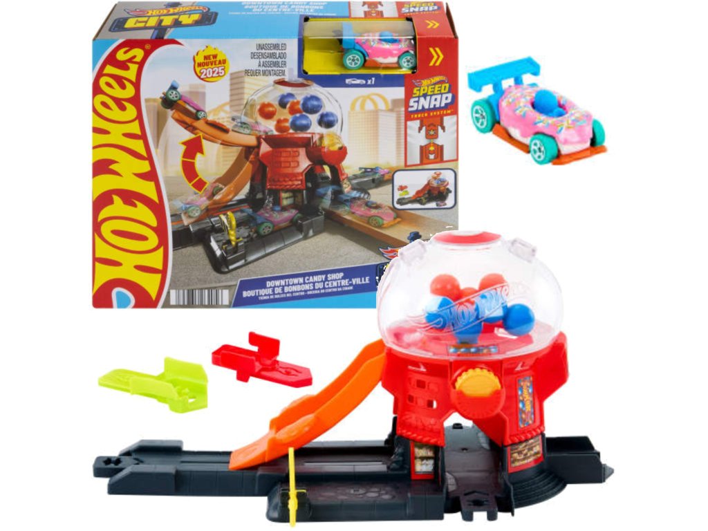 Tato hračka je skvělá sada, která povzbudí vaše dítě, aby si vytvořilo své vlastní město, sestávající z dráh pro auta ve tvaru různých sladkostí a autíčka Hot Wheels v měřítku 1:64.
