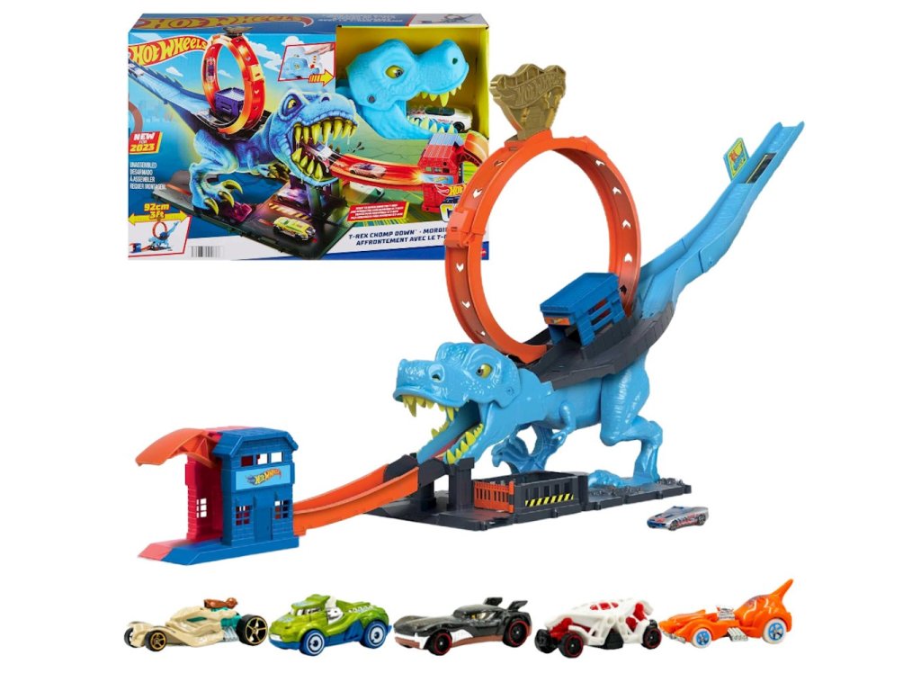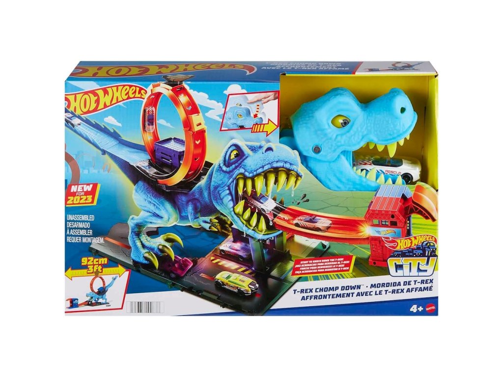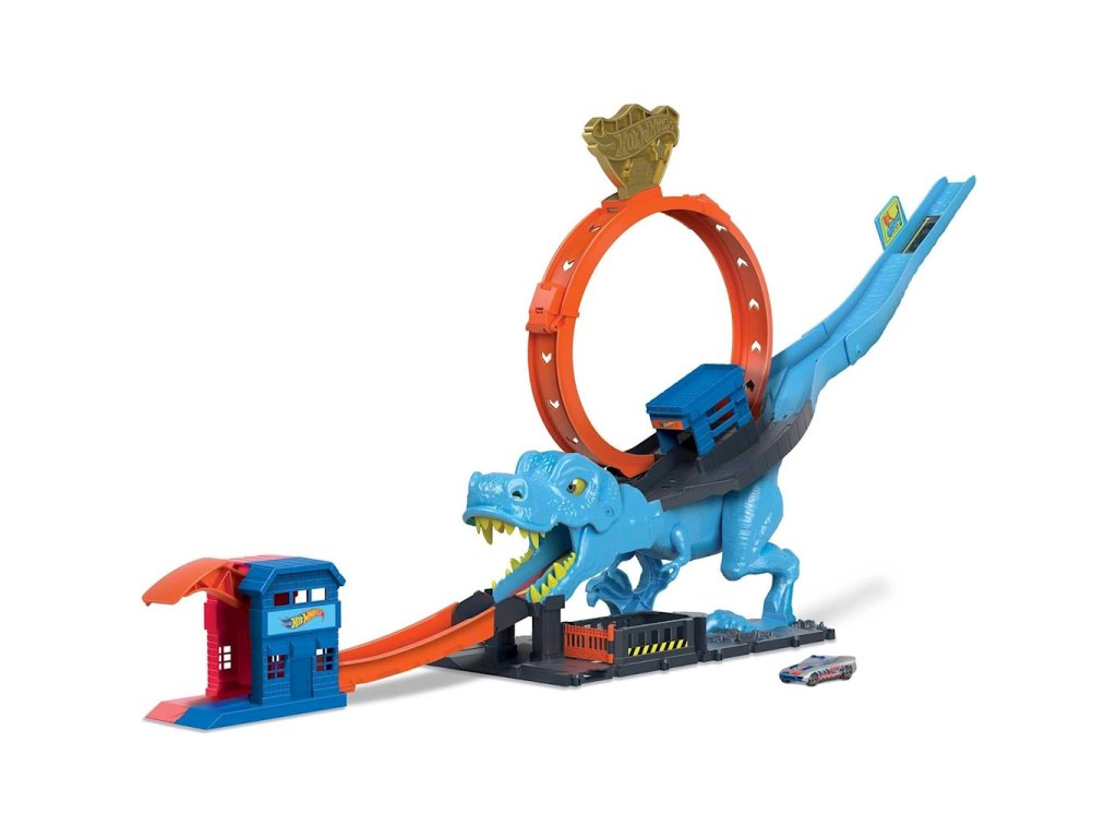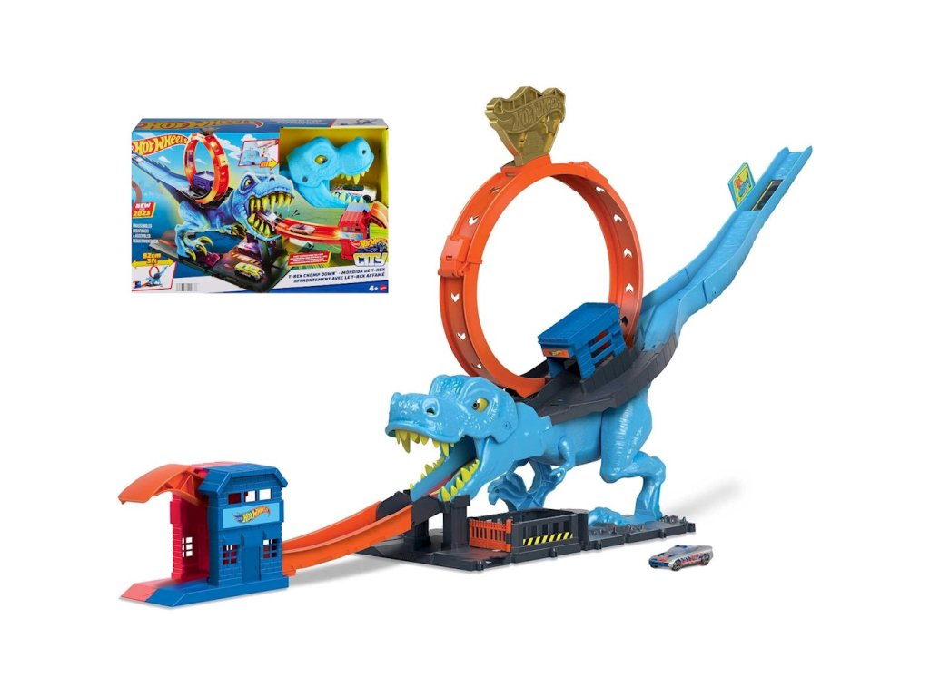 Sada 5 aut Hot Wheels City T-Rex Loop HKX42 + Street Beasts HTV55Porazte dinosaura a zachraňte město se sadou Hot Wheels™ City T-Rex Loop! Projeďte si čelistmi mocného T-Rexe, který se snaží zničit Hot Wheels™ City! Miřte svými výstřely, abyste srazili predátora a zachránili město. Dráha se propojuje s dalšími sadami a umožnila vám vytvořit si vlastní svět Hot Wheels™ City.