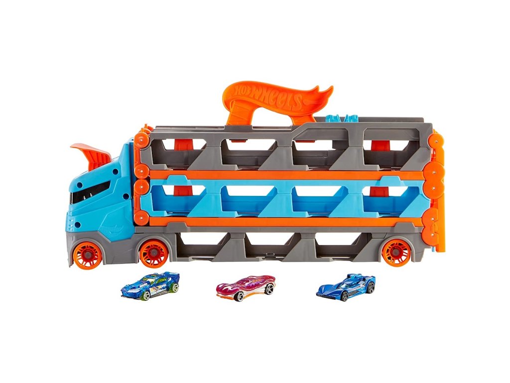 Je čas posunout extrémní zábavu na ještě vyšší úroveň s Transporterem 2 v 1 od Hot Wheels. Transportér pojme 22 autíček Hot Wheels - můžeš si je prohlédnout malými okénky v přívěsu. Zatáhnutím za rukojeť a rozložením se transportér promění v závodní dráhu, která je dlouhá až 1,8 m! Uložená vozidla jsou stále vidět pod dráhou a kabina nákladního auta se změní na dvojitý odpalovací zařízení, které vyšle dvě auta do vzrušujícího závodu. Páka na konci dráhy způsobí, že první z vozidel dojede do cíle a závod vyhraje, zatímco druhé vozidlo čeká havárie! Sada se kombinuje s dalšími hracími sadami Hot Wheels City. Sada obsahuje tři autíčka Hot Wheels v měřítku 1:64.Jedinečné vlastnosti sady: