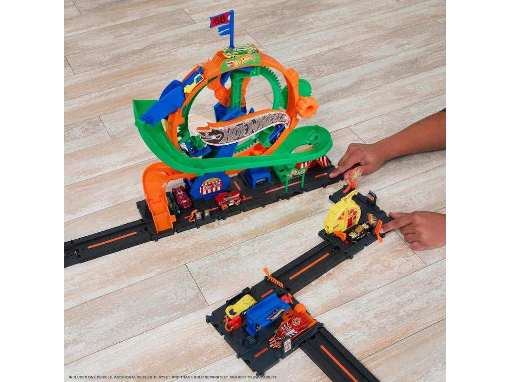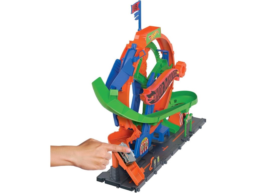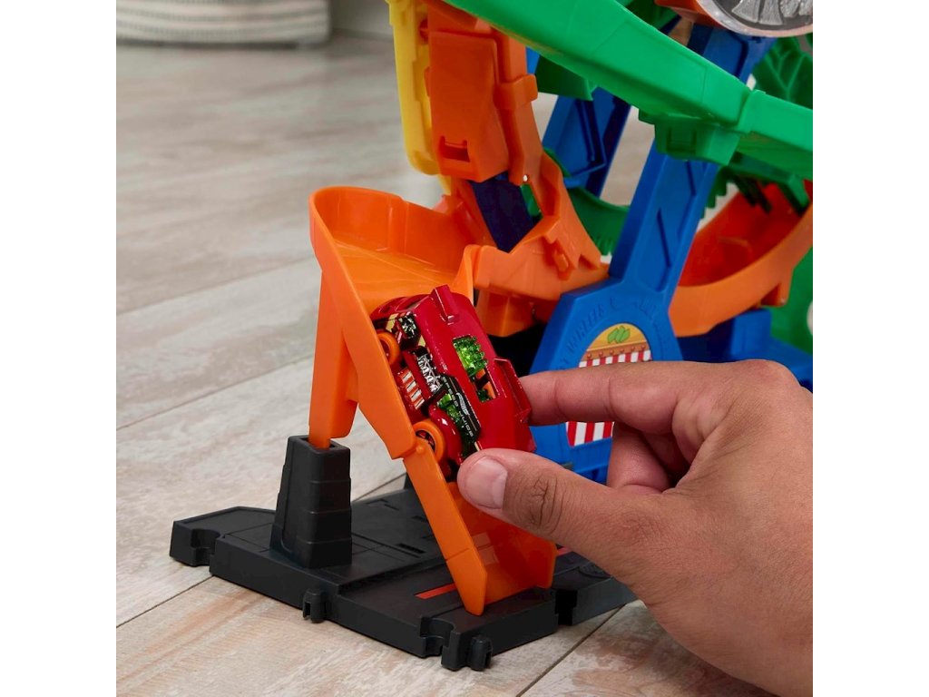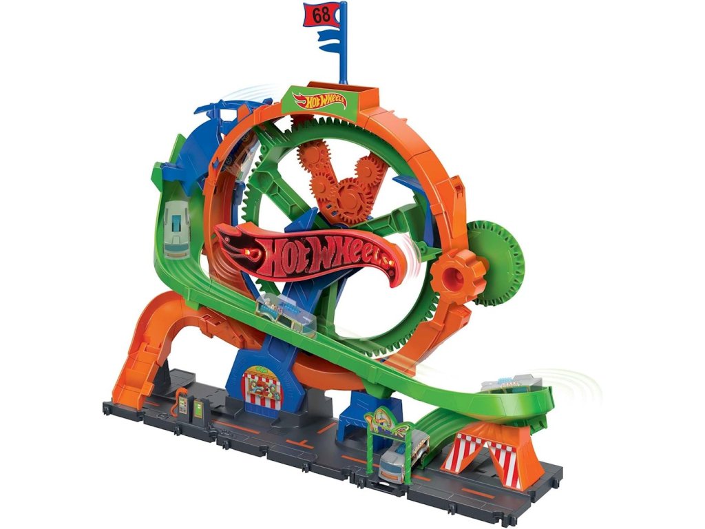 Hot Wheels City Ruské kolo se světly a zvuky HKX46 + Hot Wheels Let's Race JDR20 5dílná sadaHerní sada Hot Wheels City obsahuje světla a zvuky připomínající kostel nebo zábavní park a lze ji otáčet. Zvedněte rampu a otočte kolem, abyste ji uvedli do pohybu. Auto se automaticky zvedne a drží ho, dokud dítě neotočí vlajku a znovu nespustí auto na dráhu. Součástí je jedno auto Hot Wheels, ale na ruském kole se mohou najednou svézt až tři.