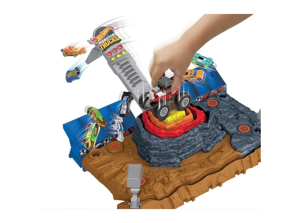 • Obsahuje 1 monstrum Hot Wheels Trucks Bone Shaker a 3 "squashová" auta, která lze umístit na drtící stojany