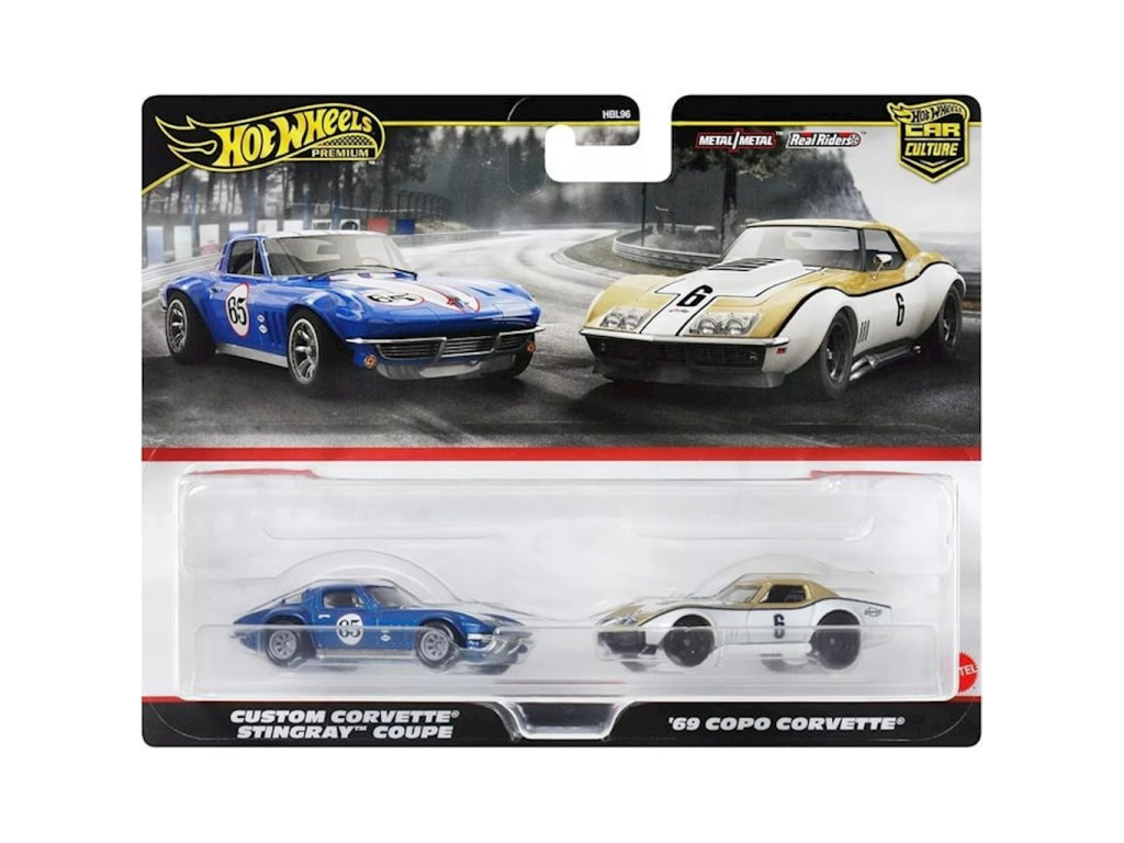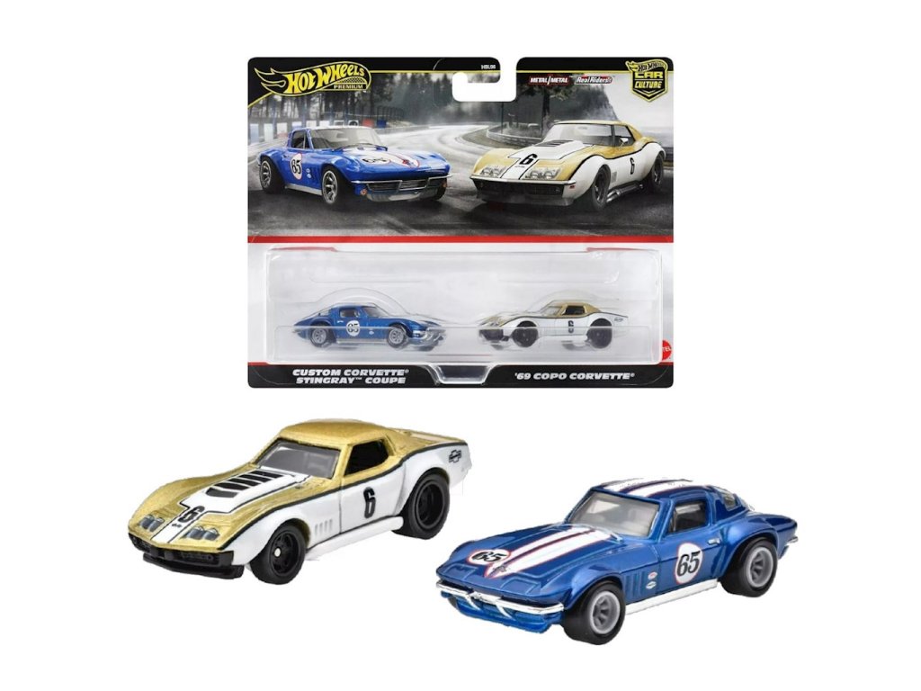 Hot Wheels Premium Car Culture Custom Corvette Stingray Coupe a '69 Copo Corvette HRR80 2-PackTento 2-Pack ikonických aut Hot Wheels® je navržen pro dospělé sběratele, kteří oceňují pečlivé detaily každého vozidla. Každý model v měřítku 1:64 v těchto sadách má vysoce kvalitní povrchovou úpravu, pneumatiky Real Riders™ a kovovou konstrukci s autentickým zdobením. Jedinečné kombinace modelů v každé sadě zvyšují sběratelství, díky čemuž je fanoušci chtějí vlastnit všechny.