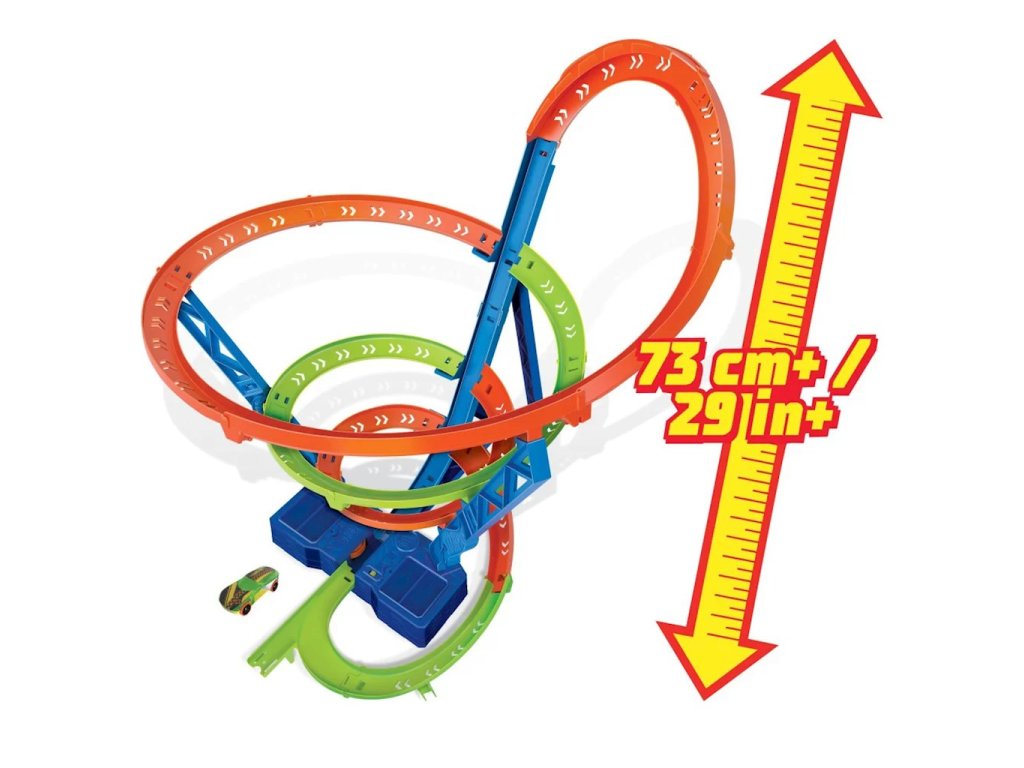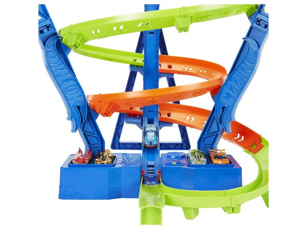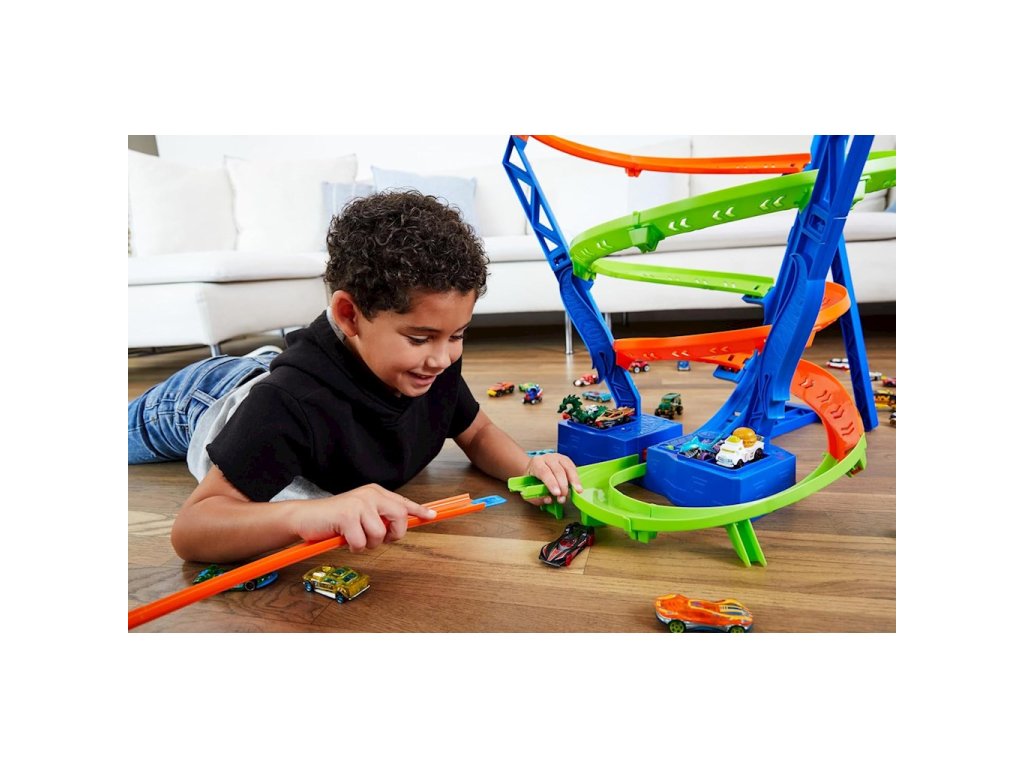 Sada Hot Wheels Racing Tornado poskytuje spoustu vzrušení díky 73 cm vysoké dráze s několika nárazovými zónami a motorizovaným zrychlovačem.