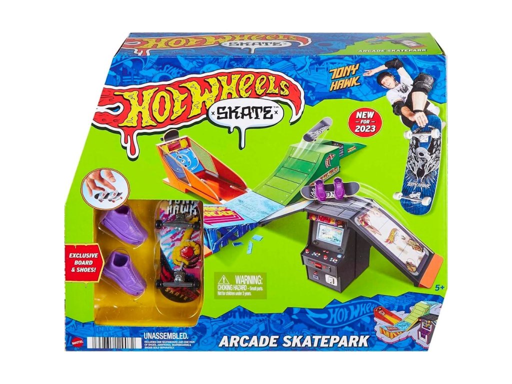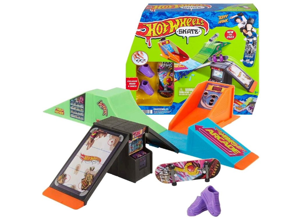Hot Wheels Skate Arcade Skatepark HMJ98Hot Wheel Skate Arcade Skatepark vám umožní předvádět neuvěřitelné triky na vašem skateboardu. Zacvakávací prvky s arkádovou tématikou lze uspořádat do několika konfigurací pro nekonečné zábavné a kreativní konfigurace. Sada obsahuje exkluzivní prkno navržené ve spolupráci s legendou skateboardingu Tonym Hawkem a pár odnímatelných skate bot, které začátečníkům pomohou získat pocit z prkna.