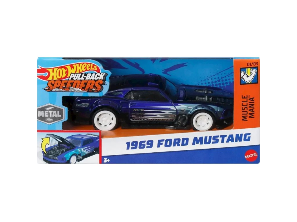 Hot Wheels Speeders Sběratelské auto 1969 Ford Mustang HWH51Model Ford Mustang z roku 1969 z řady Hot Wheels je extrémně detailní vozidlo v měřítku 1:43, které dokonale odráží vlastnosti sportovního vozu. Má nízké odpružení, modrou karoserii a otevírací kapotu, což z něj dělá skutečný sběratelský skvost. Patří do nové řady Speeders a je vybavena natahovacím pohonem. Díky speciálním pružinám v zadních kolech jej stačí zatáhnout zpět a může ujet přes tři metry.