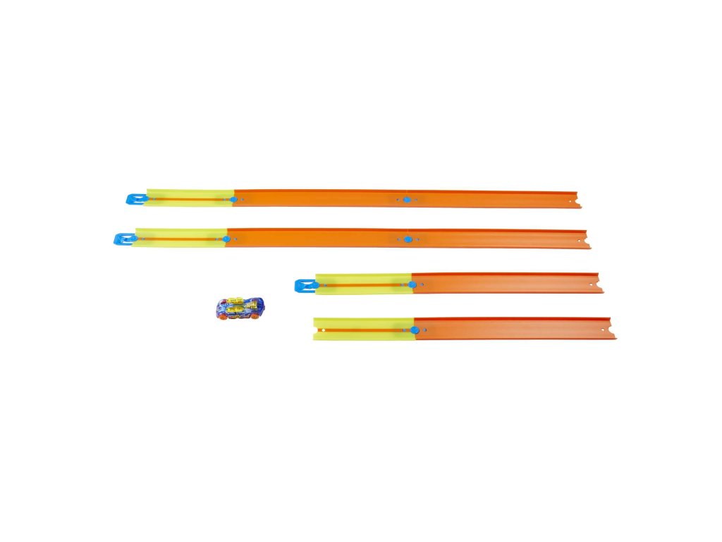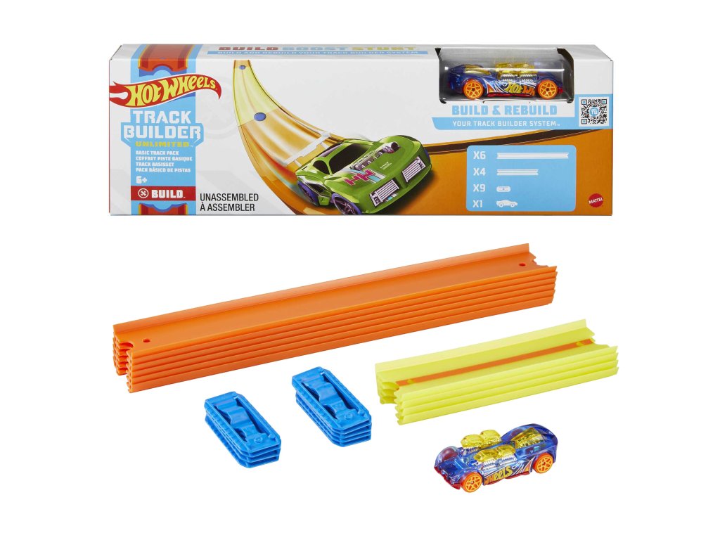 Dráhy Track Builder lze různě uspořádat, takže autíčka mohou jezdit po stále obtížnějších trasách. Sada obsahuje jednovozidlo Hot Wheels v měřítku 1:64.