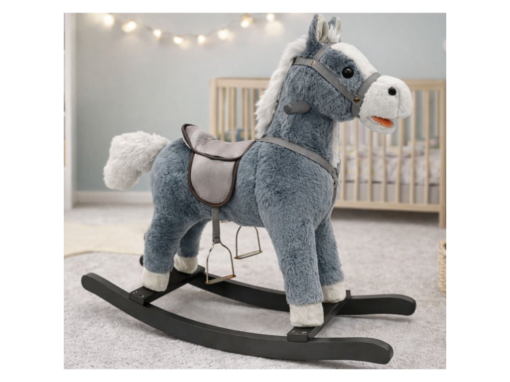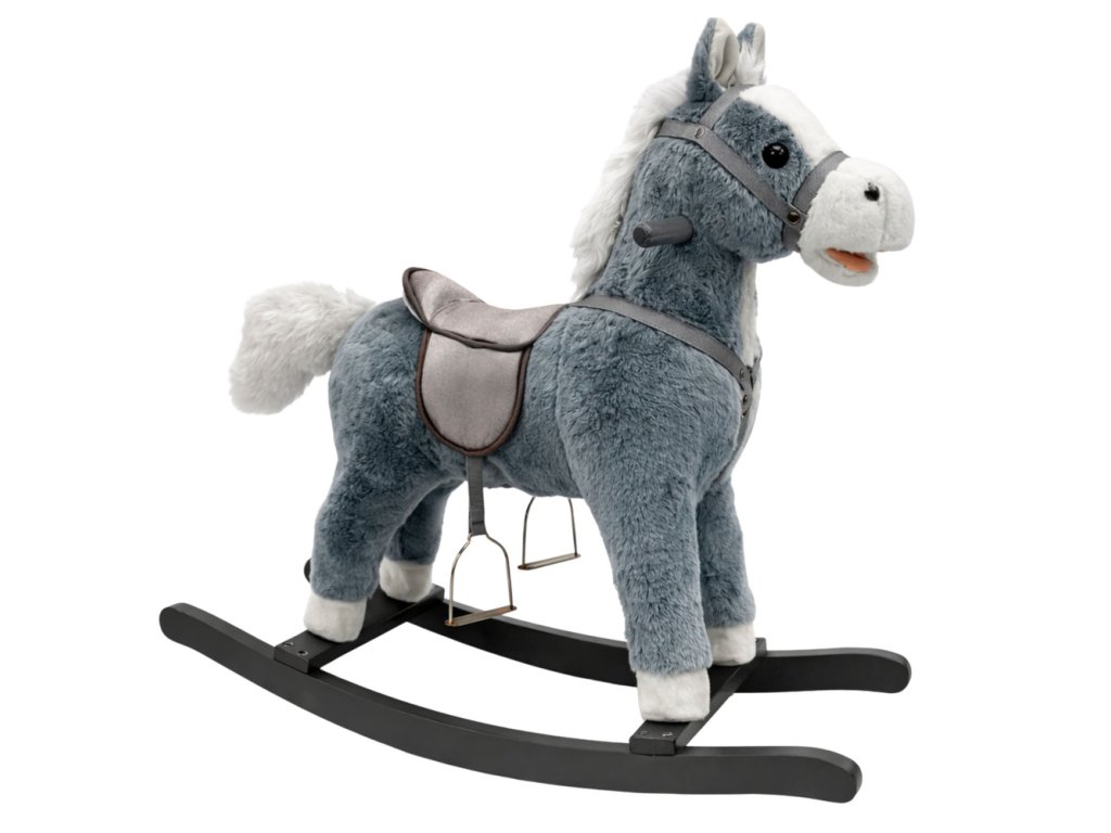 Šedý houpací kůň se svými působivými rozměry 74 cm x 22 cm x 48 cm je snem všech milovníků zvířat a dobrodružství! Jeho povrch je pokryt jemným, měkkým materiálem, který poskytuje příjemný dotek.
