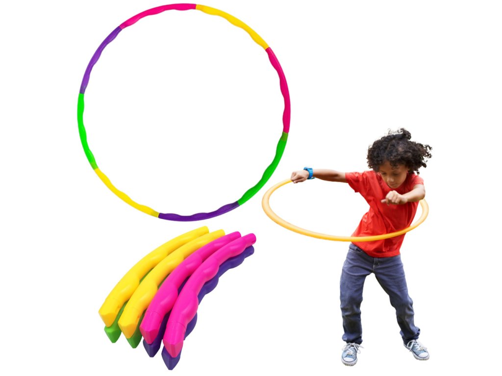 Obruč o průměru 50 cm se skládá ze 7 lehkých, snadno spojitelných prvků, což umožňuje rychlou montáž a pohodlné skladování a přepravu – ideální řešení jak na doma, tak na cesty. Barevné segmenty – žlutá, zelená, fialová a růžová – dodávají hula hoopu atraktivní vzhled a navíc motivují k pohybu.