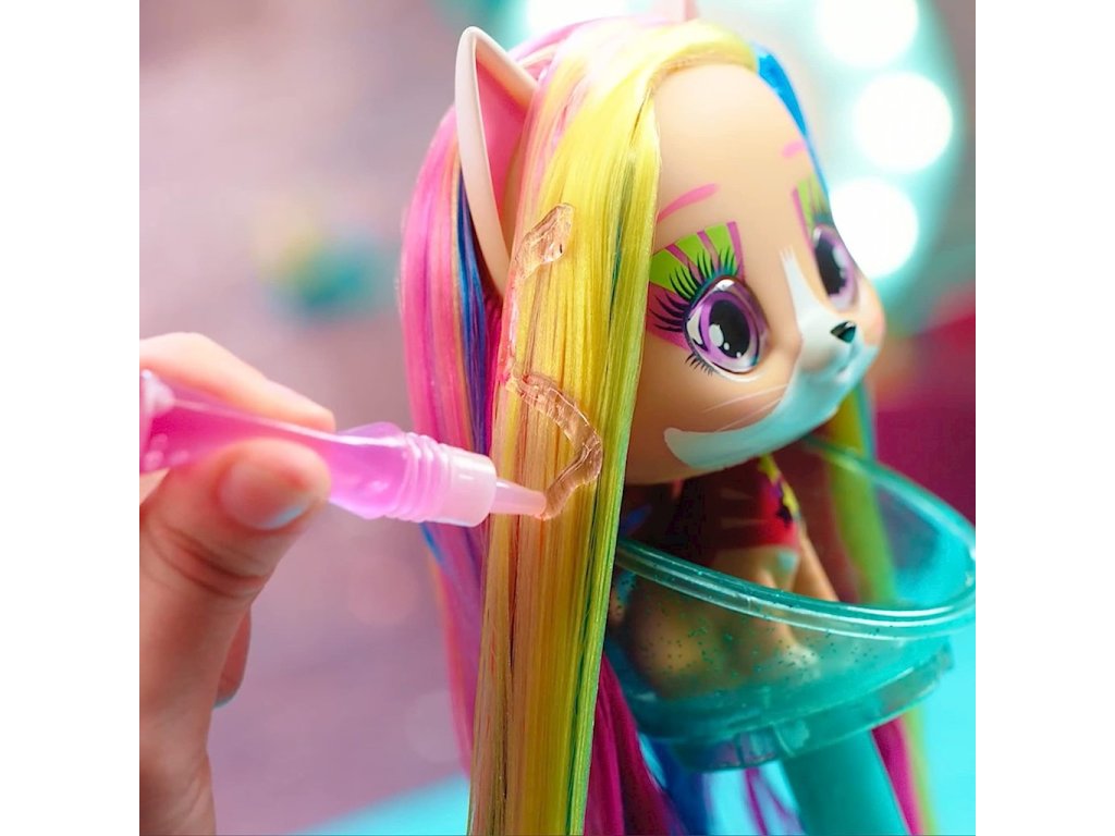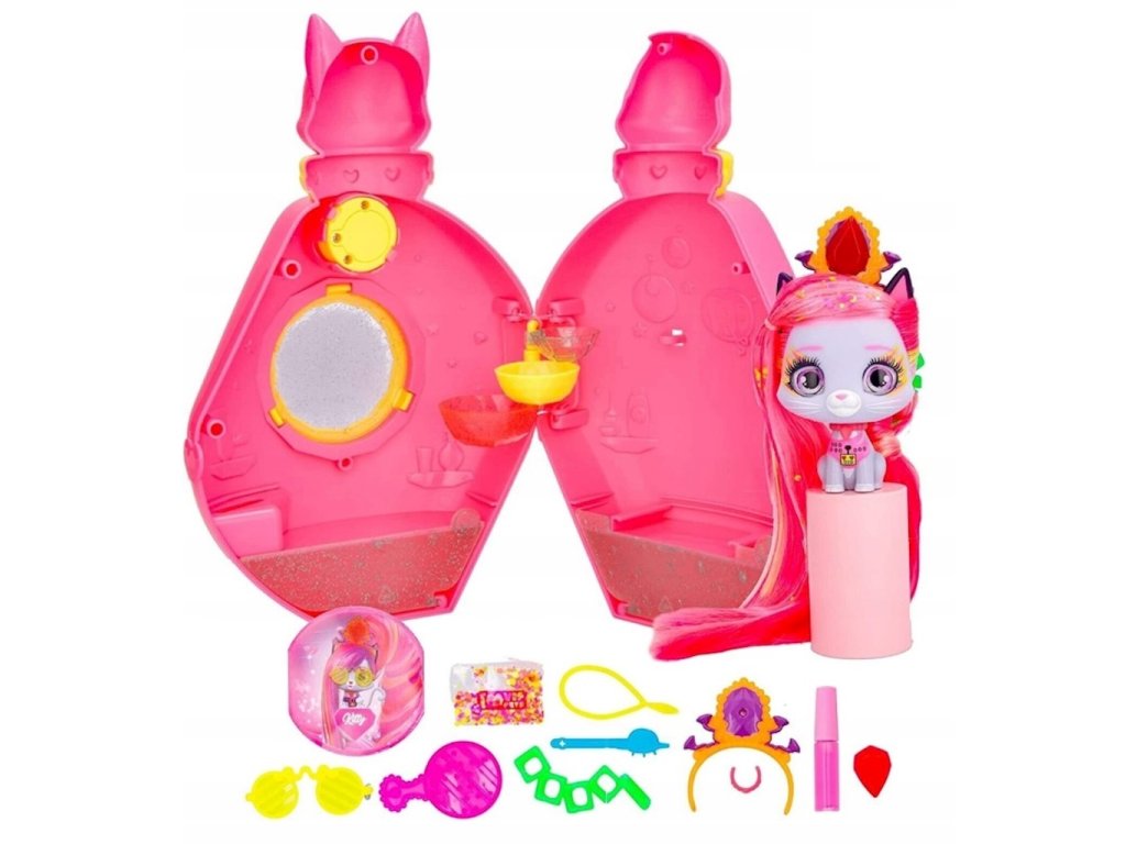 IMC Toys I Love Vip Pets Cats Figurka Kočka s dlouhými vlasy pro styling Kitty 714502VIP Pets Cats je zcela nová kolekce koček! V sérii je k objevování 6 koček. Každá figurka ze série se vyznačuje pečlivým zpracováním a precizně propracovanými detaily. Kočky mají nádherné dlouhé vlasy v bláznivých barvách. Barvy používané k barvení vlasů jsou netoxické, takže nehrozí alergie. Otevřete balíček a poznejte svého mazlíčka a objevte 10 překvapení. Každá z koček má jinou sadu doplňků a doplňků pro úpravu vlasů. Kromě toho je každá sada dodávána s mini průvodcem, který vás krok za krokem provede procesem vytvoření úžasného účesu.