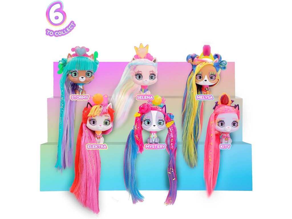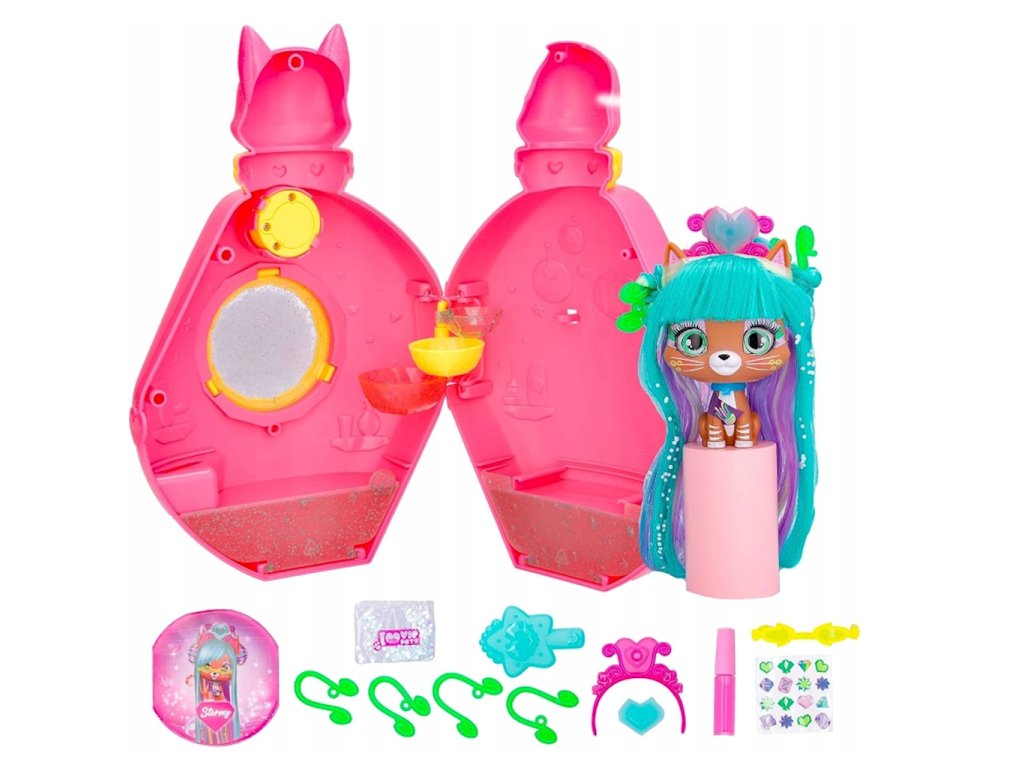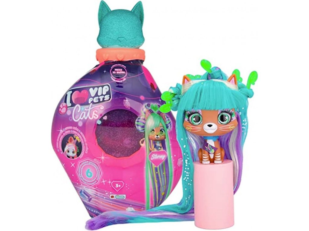 IMC Toys I Love Vip Pets Cats Figurka kočka s dlouhými vlasy pro styling Stormy 714533VIP Pets Cats je zcela nová kolekce koček! V sérii je k objevování 6 koček. Každá figurka ze série se vyznačuje pečlivým zpracováním a precizně propracovanými detaily. Kočky mají nádherné dlouhé vlasy v bláznivých barvách. Barvy používané k barvení vlasů jsou netoxické, takže nehrozí alergie. Otevřete balíček a poznejte svého mazlíčka a objevte 10 překvapení. Každá z koček má jinou sadu doplňků a doplňků pro úpravu vlasů. Kromě toho je každá sada dodávána s mini průvodcem, který vás krok za krokem provede procesem vytváření úžasného účesu.