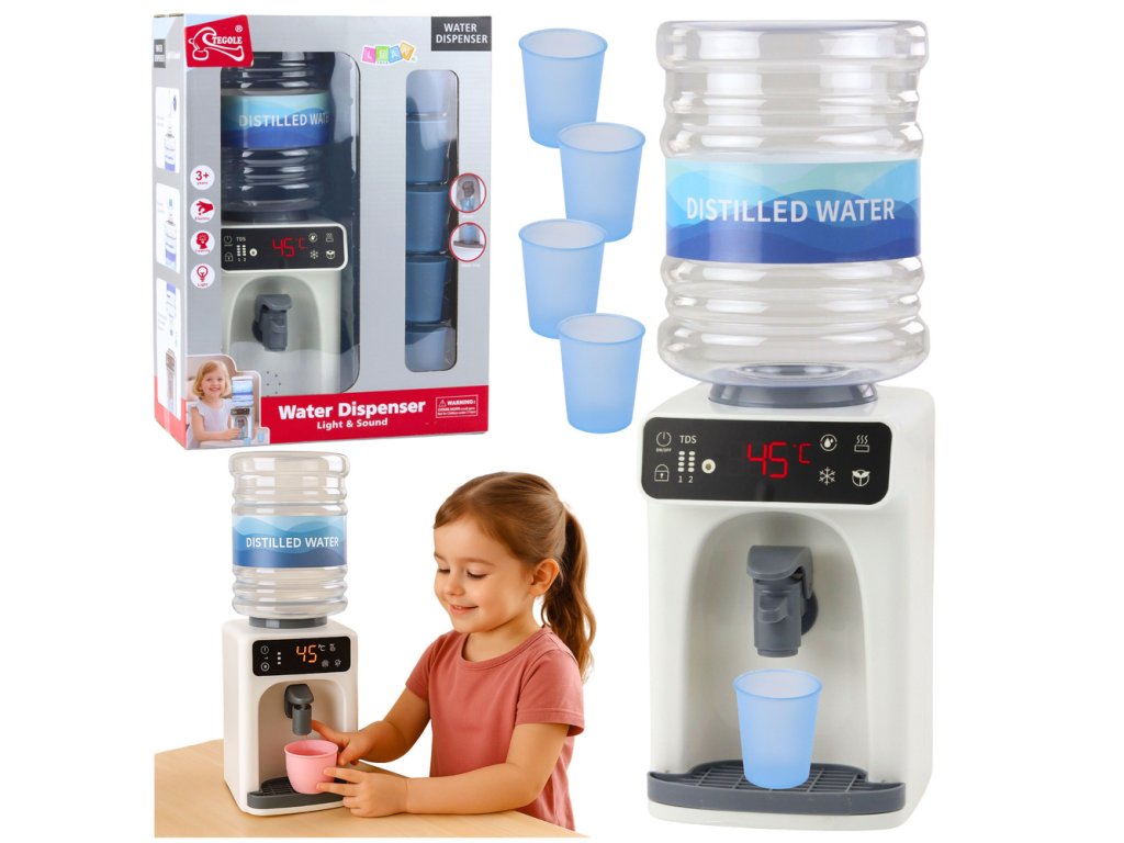 Interaktivní světelný a zvukový dávkovač vody pro děti je unikátní hračka, která replikuje fungování skutečného zařízení a seznamuje malé děti se světem každodenních činností. Realistické světelné a zvukové efekty, funkce nalévání vody a přiložená lahev umožňují dětem samostatně si připravovat nápoje a zároveň rozvíjet motorickou koordinaci, kreativitu a návyky péče o sebe.