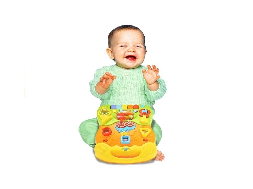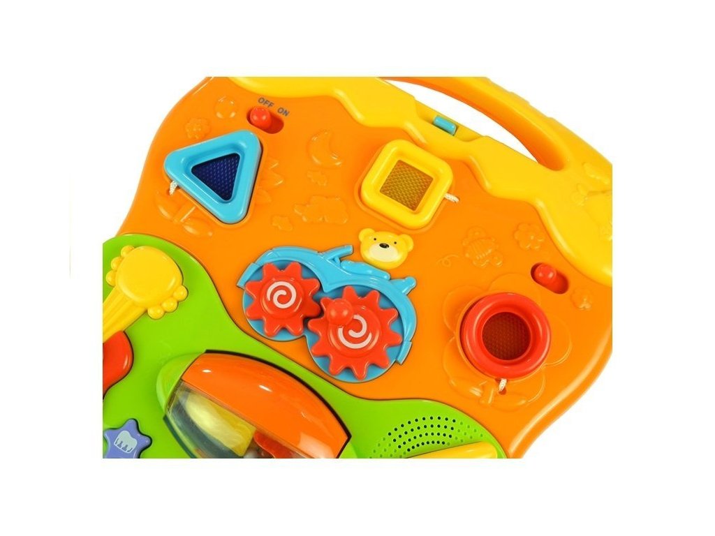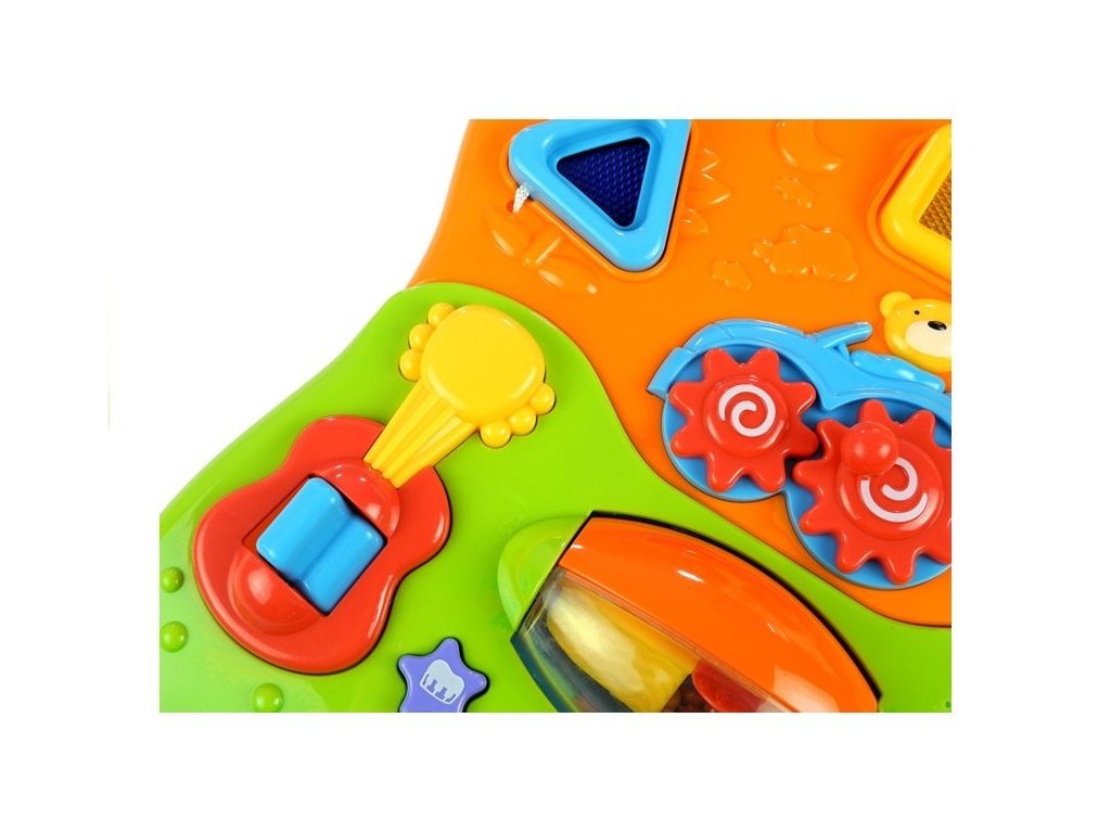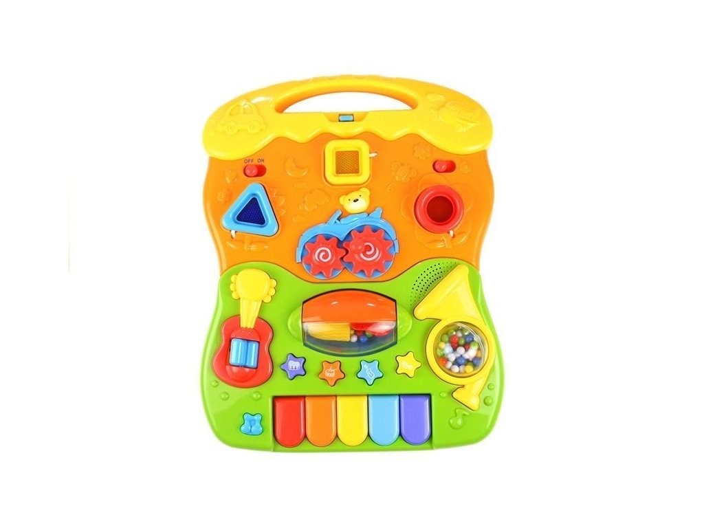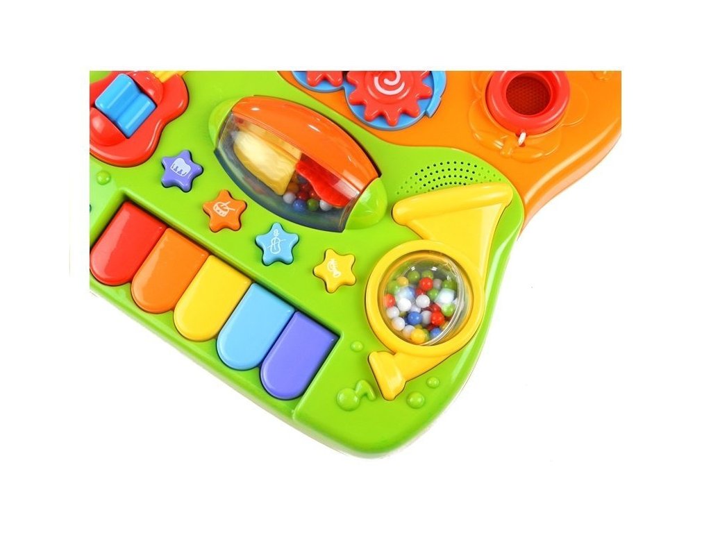 Vícebarevný panel je vyplněn barevnými světly a tlačítky. Batole si může hrát s otočnými chrastítky, klíči a prvky na provázcích. Hračka má vypínač a ovládání hlasitosti, což je užitečné mimo jiné při večerní zábavě. Jak kreativně využít panel? V mnoha ohledech! Stisknutím hvězdy dítě uslyší housle, trubku a dokonce i buben. Současným stisknutím všech hvězdiček se aktivuje společná melodie. Stisknutím prvku na kytaře se aktivuje a dítě uvidí barevná světýlka - správně sladěné figurky na strunách fungují podobně. Hračka je vybavena i malým klavírem, na kterém si může batole vytvářet vlastní skladby.