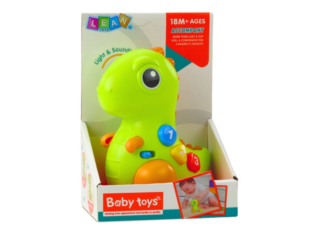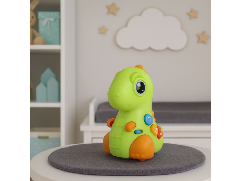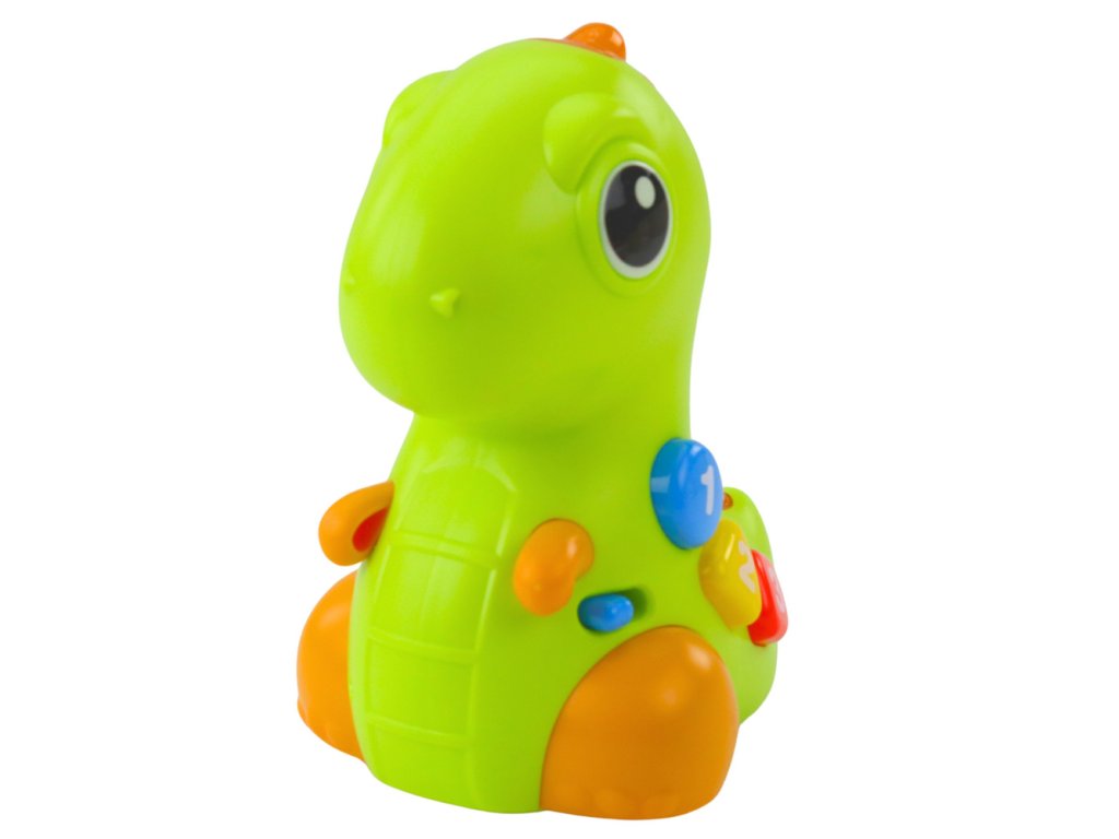 Dinosaurus má číselná tlačítka, která mu pomáhají učit se čísla, barvy a tvary. Stisknutím jednoho z barevných tlačítek aktivujete světelné a zvukové efekty, zatímco jemným poklepáním na jeho nos se aktivuje hudba, zábavné zvuky a pohyb. To umožňuje vašemu dítěti rychle objevit vztah mezi dotykem a reakcemi hračky, což podporuje zážitkové učení.