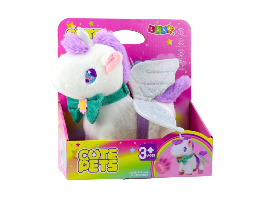 Tento interaktivní plyšový jednorožec je jedinečná hračka, která přenese děti do světa pohádkových kouzel. Okouzlující, měkký a příjemný na dotek, má třpytivá křídla a barevnou mašli, díky čemuž je oblíbeným plyšovým zvířátkem každé malé princezny. Hračka reaguje na dotek – jednoduše pohladit jednorožce na zádech, aby se aktivovaly jeho funkce: chůze, vrtění ocasem, řehtání a zvuky cvalu.
