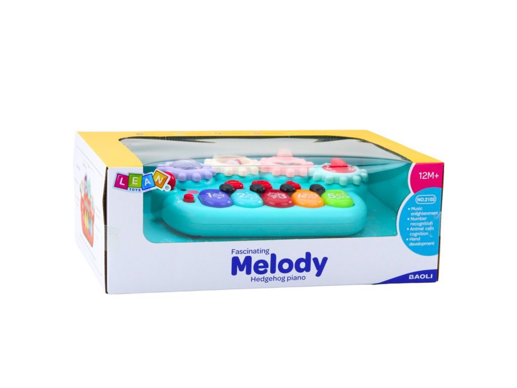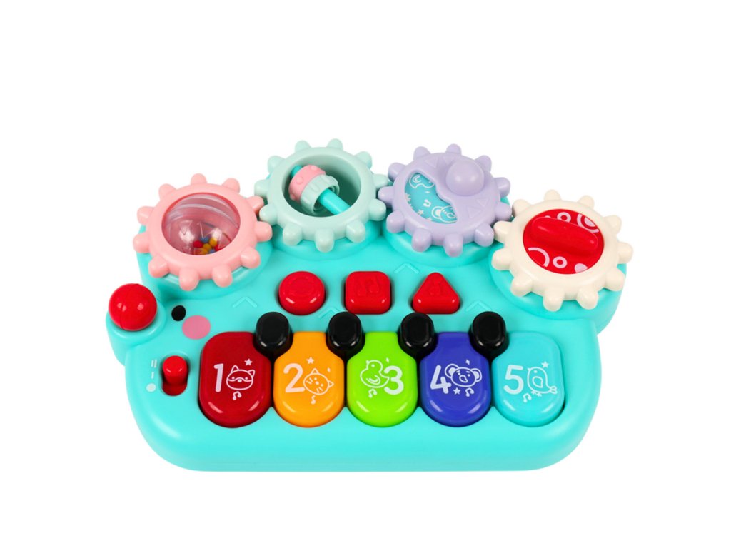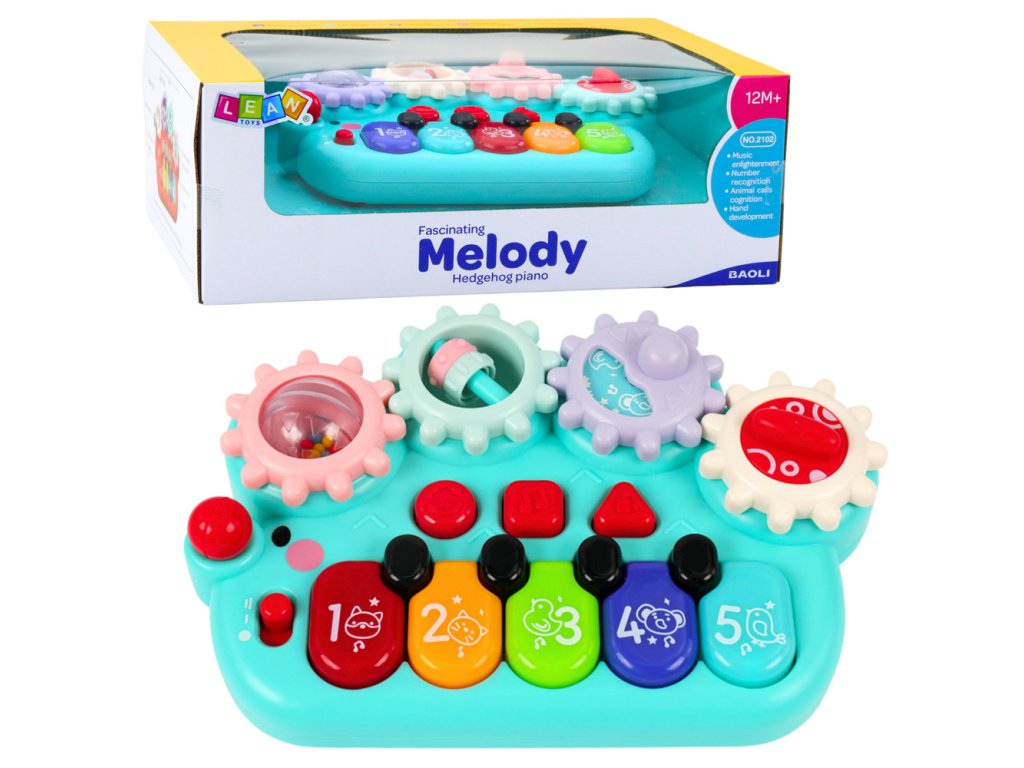 Panel má 5 barevných kláves s vytištěnými čísly a zvířaty, která po stisknutí vydávají zvuky a melodie. Další atrakcí jsou otočná ozubená kola umístěná v horní části klavíru - dítě je může roztočit, procvičit si koordinaci oko-ruka a jemnou motoriku.