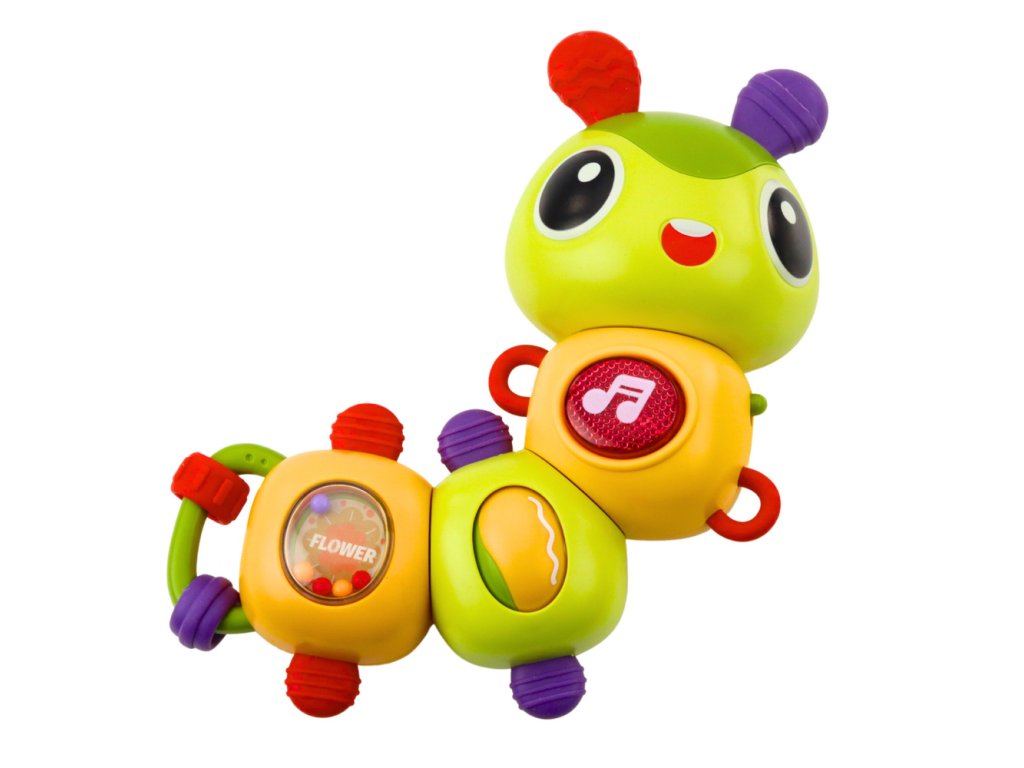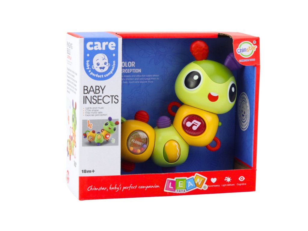 Housenka se může pochlubit atraktivním designem v pohádkovém stylu, který upoutá pozornost miminka. Obsahuje pohyblivé části, které se otáčí o 360°, zábavné cvakání a barevná LED světla s hudebními efekty, které se osvětlují v rytmu melodie. Díky tomu je hra ještě dynamičtější a poutavější.