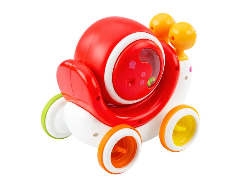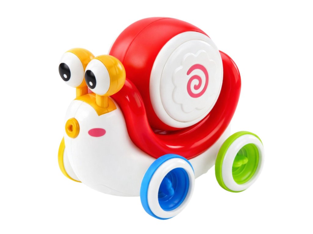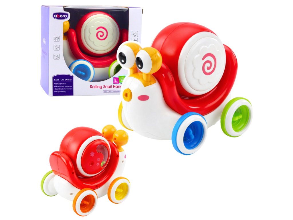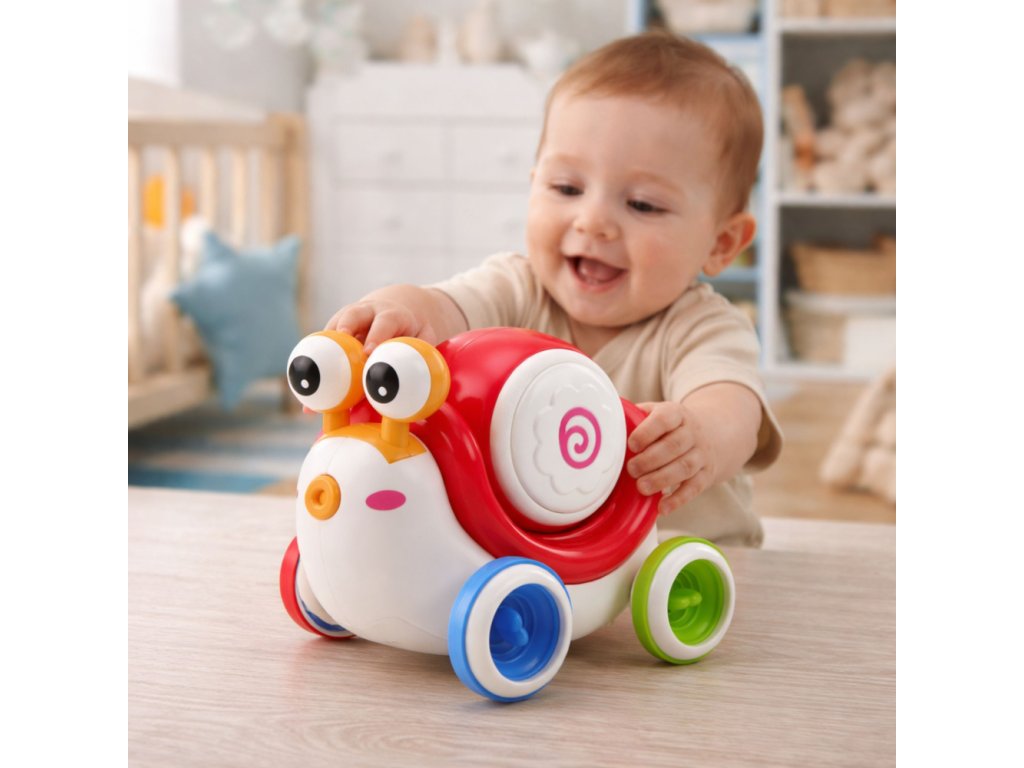 Hračka je vybavena měkkými silikonovými kolečky, která lze mačkat a vysouvat, což je skvělé pro rozvoj jemné motoriky. Šnečí oči jsou pohyblivé – stisknutím jednoho vyskočí druhé, což dětem poskytuje zábavu a učí je příčinu a následek. Kolečka umožňují tlačení hračky, což podporuje pohyb a aktivitu.