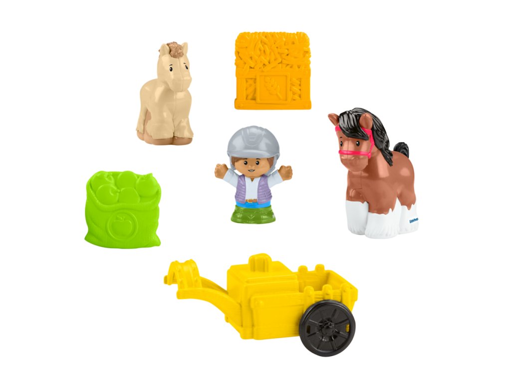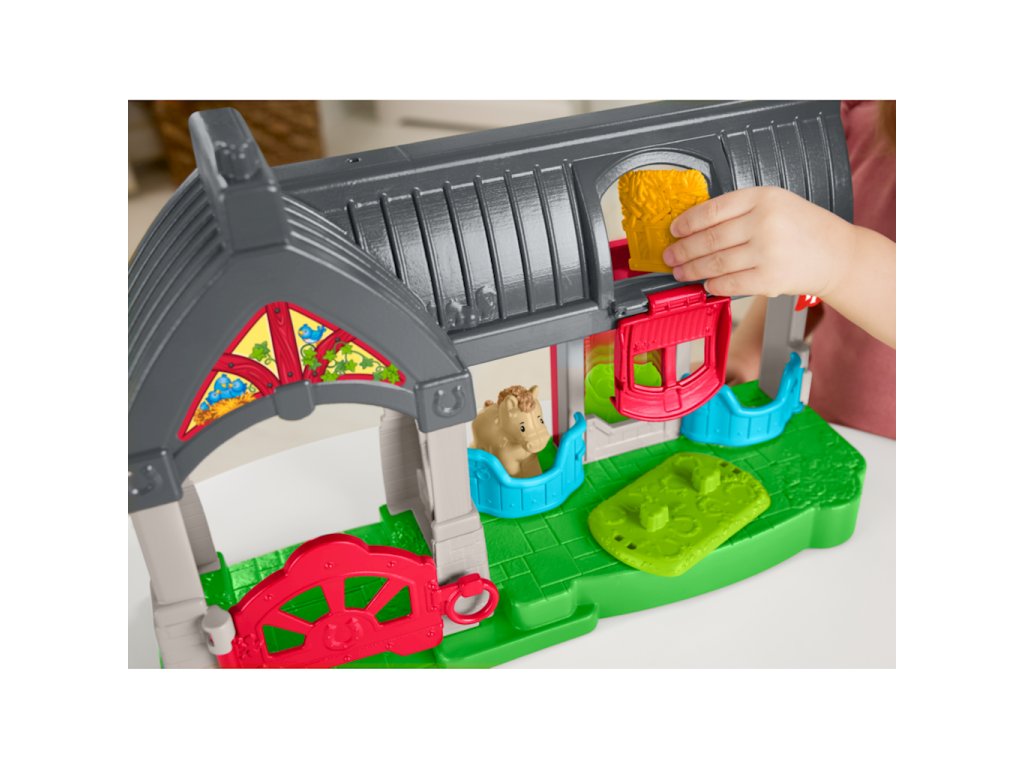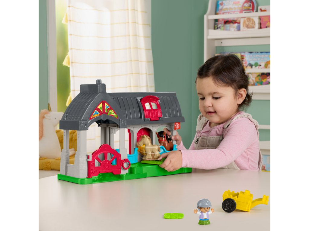 Fisher-Price Hudební stáj Little People HWR84Fisher-Price Přátelská koňská stáj Little People. Stáj obsahuje 3 hrací boxy s figurkami koní a poníků, otočný kolotoč se zábavnými zvuky, krmný žlab a přívěs pro připevnění a přepravu příslušenství. Malí lidé si zamilují ukazování koní ve stáji, otáčení kolotočem, krmení a honění k odpočinku.