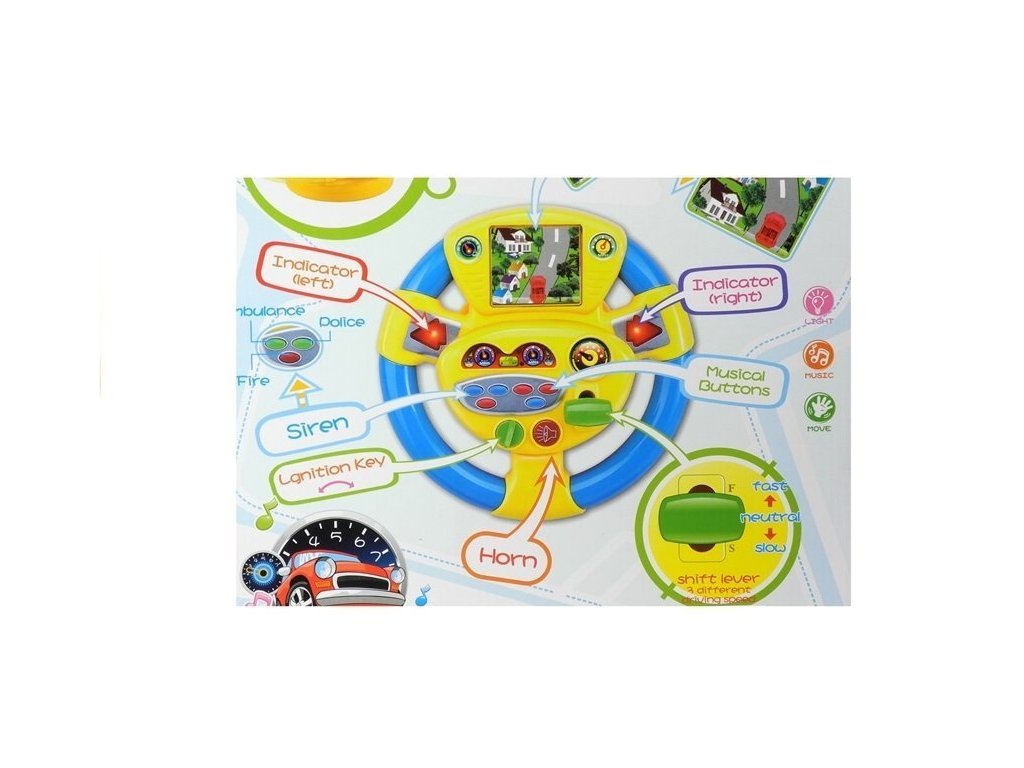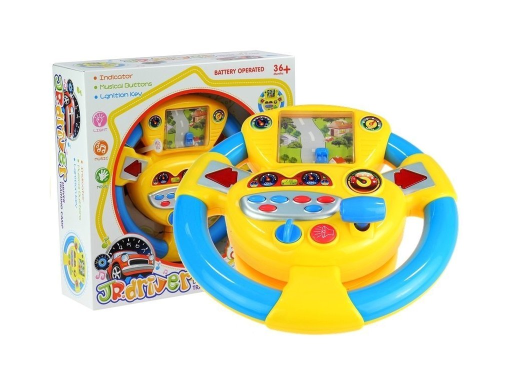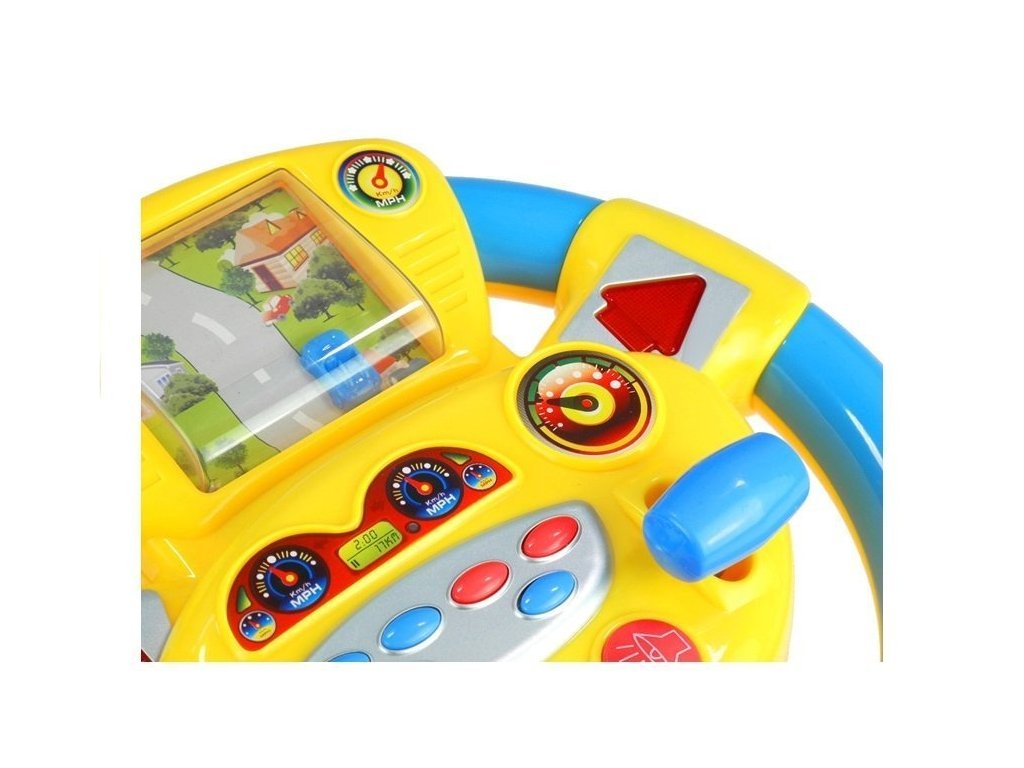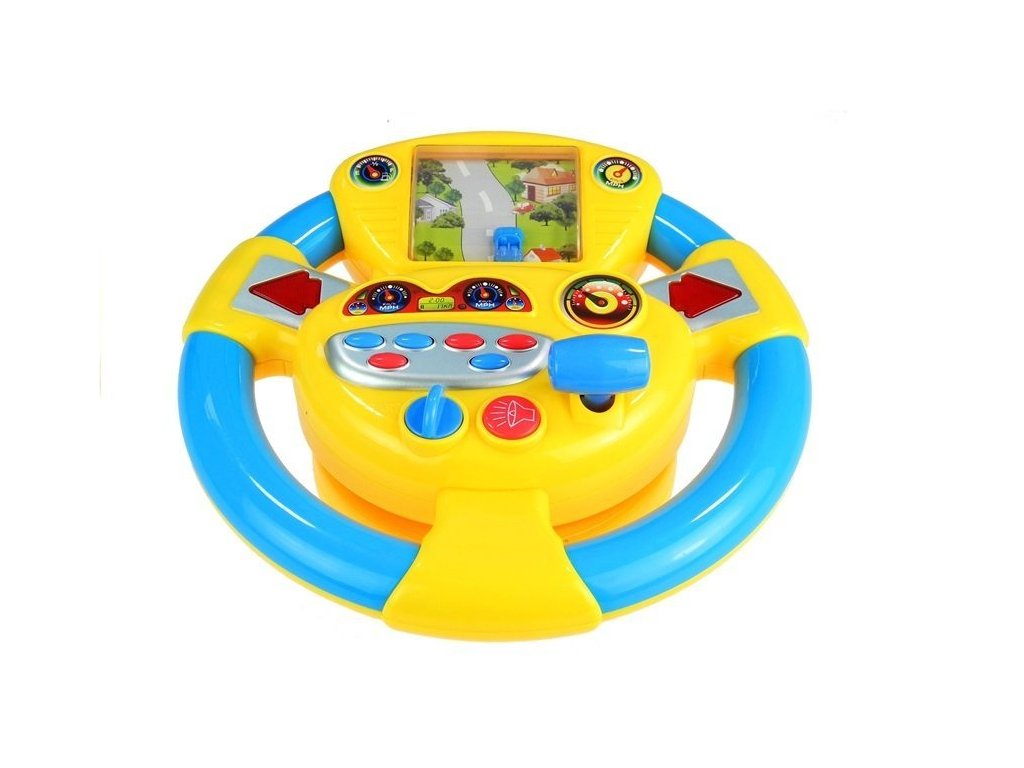 Tato hračka má mnoho funkcí a vybavení. Mimo jiné se vyznačuje velkou obrazovkou a také fenomenálními světelnými a zvukovými efekty. Otočením volantu dítě přiměje auto na obrazovce k pohybu po šedé silnici. Jeho vedení pozitivně ovlivní vývoj dítěte, podpoří jeho koncentraci a pozornost. Při hraní slouží šipky jako ukazatele směru, při stisku daného tlačítka se aktivuje klakson a šest různých zvukových efektů. Hračka je vyrobena z kvalitního, pro děti bezpečného materiálu, který v kombinaci s poutavou, intenzivní žlutou a tyrkysovou barvou působí prvotřídně. Volant pro dítě je umístěn na stabilní protiskluzové podložce, která usnadňuje hru.