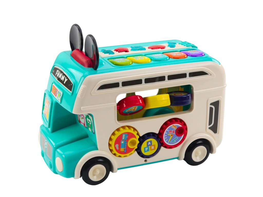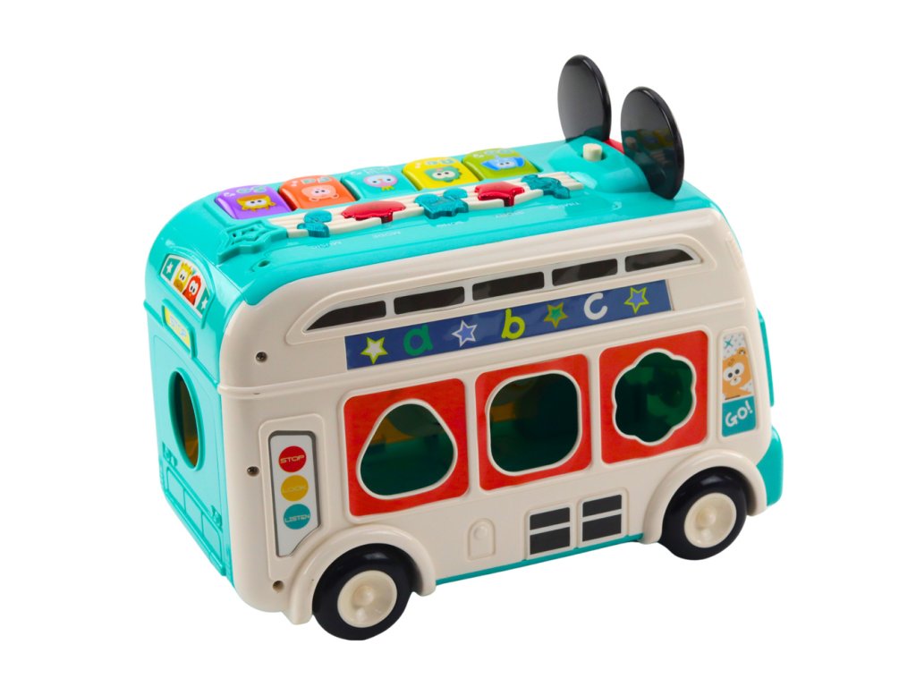 Autobus je vybaven otvory pro bloky s písmeny, které si dítě může přiřazovat na vhodná místa a rozvíjí tak své vnímání a přesnost pohybů. Na bočních stěnách jsou otočné disky a interaktivní prvky, které poskytují další smyslové podněty a podporují aktivní zkoumání.