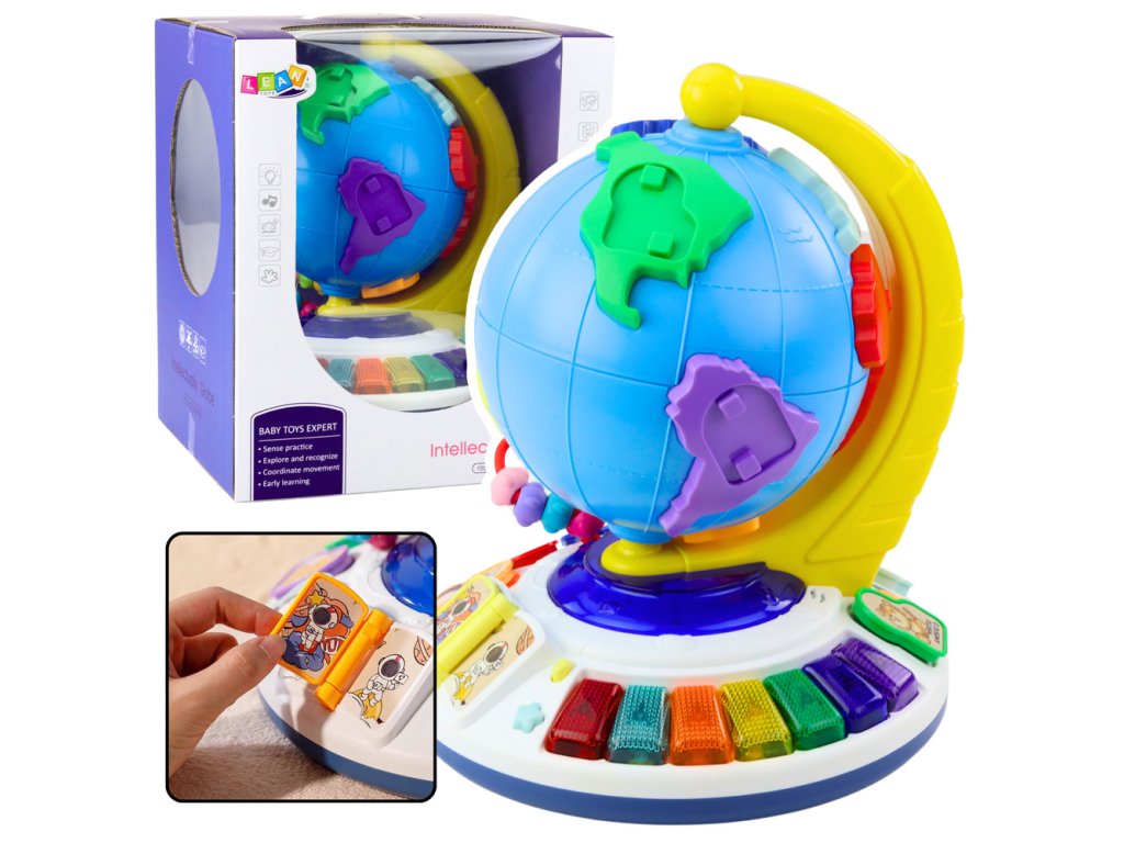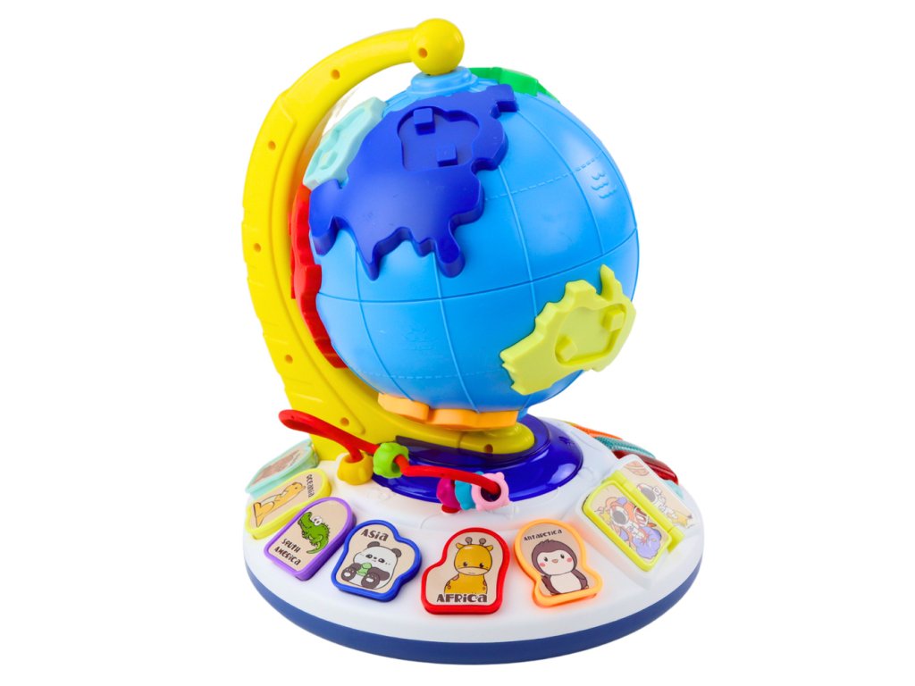 Na povrchu zeměkoule se nachází 7 barevných, odnímatelných bloků představujících kontinenty s natištěnými roztomilými zvířátky charakteristickými pro daný region. Po jejich umístění na správná místa dítě uslyší název kontinentu, jméno zvířete a jeho realistický zvuk - je to skvělý způsob, jak se učit zeměpis a rozvíjet sluch a paměť.