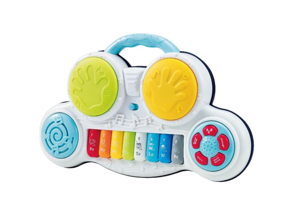 Hračka má 8 klavírních kláves, které nejen hrají hudební zvuky, ale také vydávají zvuky zvířat, čímž batoleti pomáhají poznávat svět kolem sebe. Dva dotykové bubny navíc povzbuzují dítě k rozvoji koordinace ruka-oko a smyslu pro rytmus a intuitivním a poutavým způsobem je uvádějí do světa hudby.
